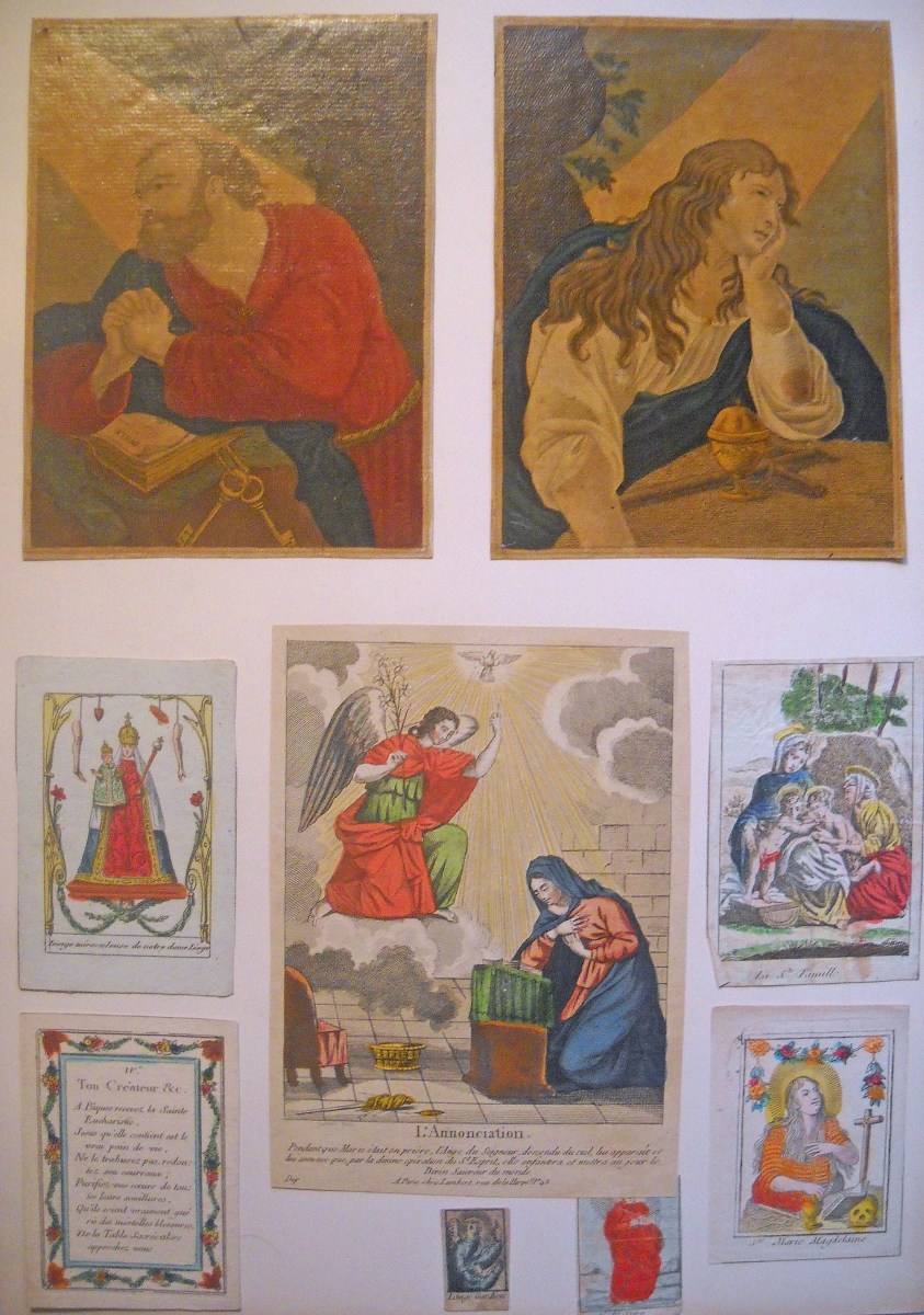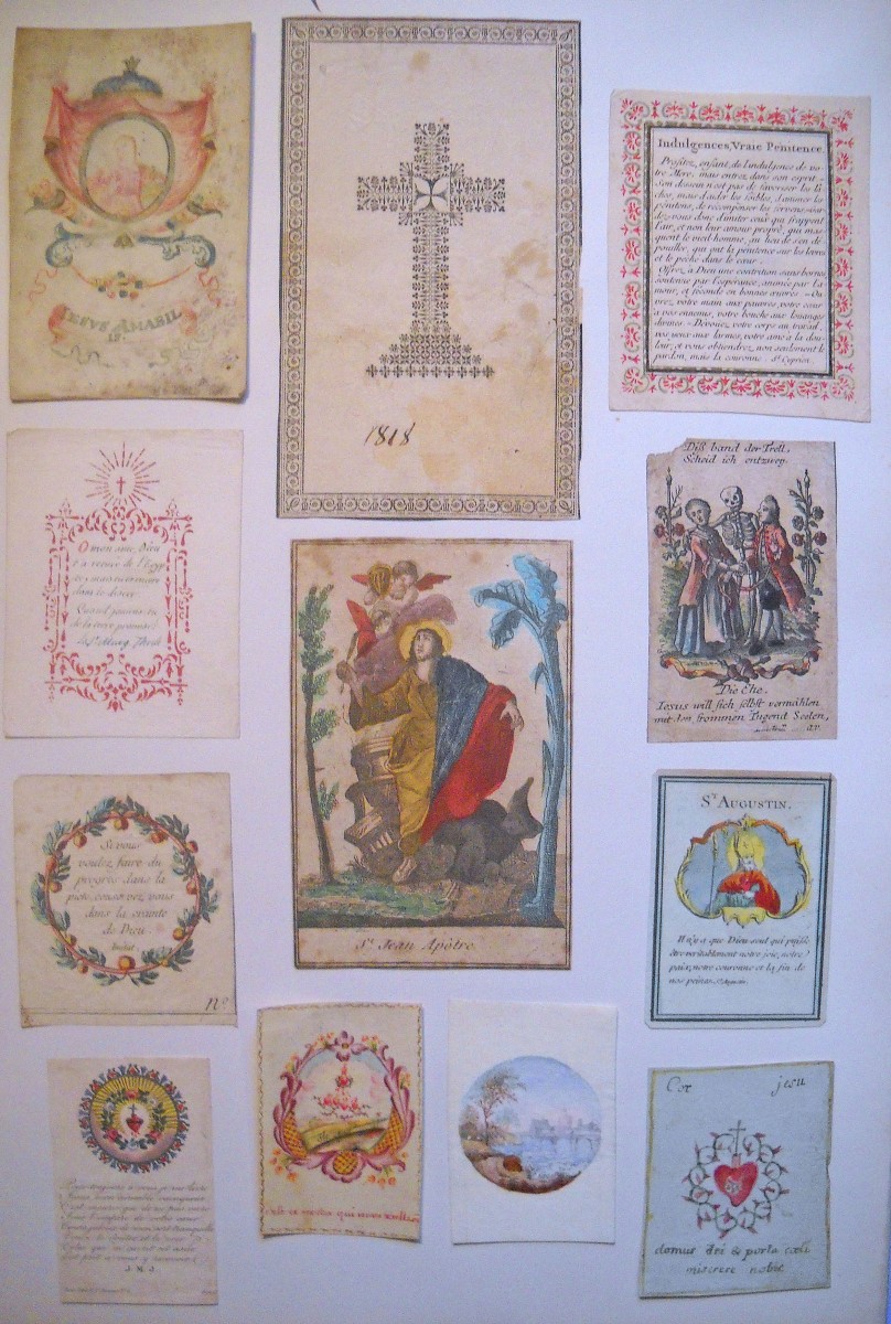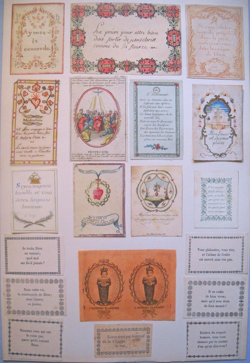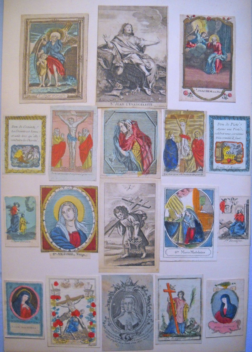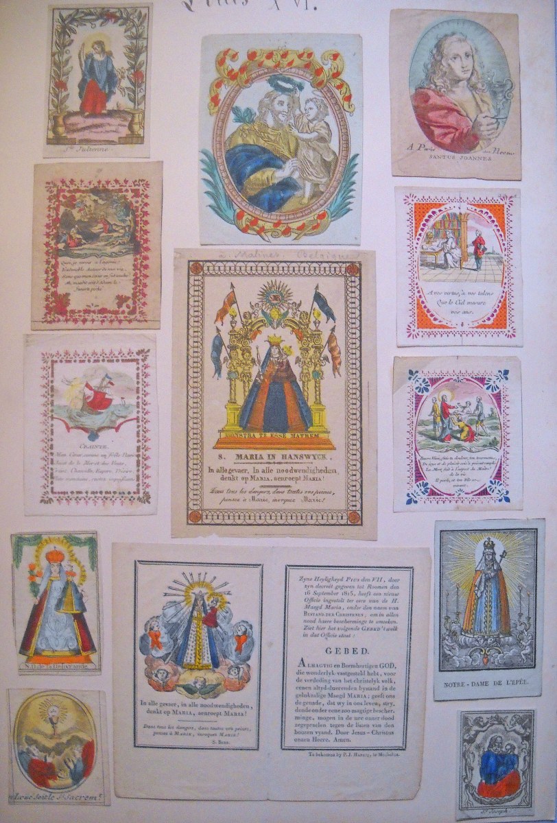 + de 390 images pieuses, en majorité gravure sur cuivre à rehauts polychromes, et quelques pièces entièrement peintes, sur papier vergé, vélin et parchemin. Dont suite de 15 p. Les stations de N.S. en sa passion par Antoine Boudet à Lyon ; maximes et dons ; vignettes ; Notre-Dame de Hanswijk à Malines ; L'intérieur de la Ste Vierge par Pierre MARIETTE ; Notre Dame de Bon Secours ; planche de scènes bibliques en taille douche chez PICARD GUERIN à Caen ; S. Bambino Di Aracoeli ; diverses représentations du Saint Suaire de Besançon dont impression tissée, etc. Contrecollées sur papier épais.