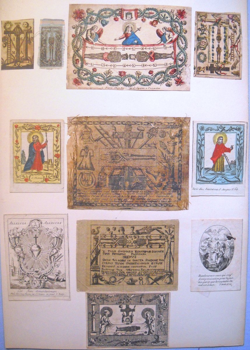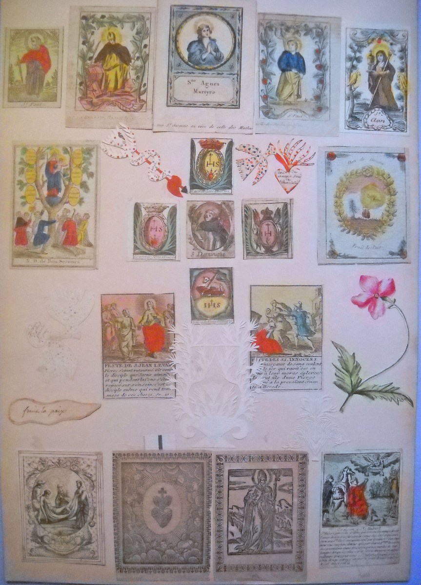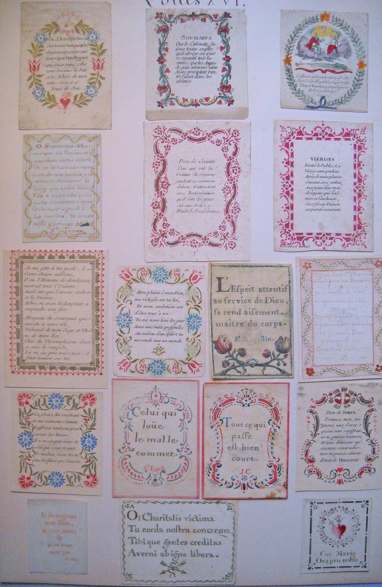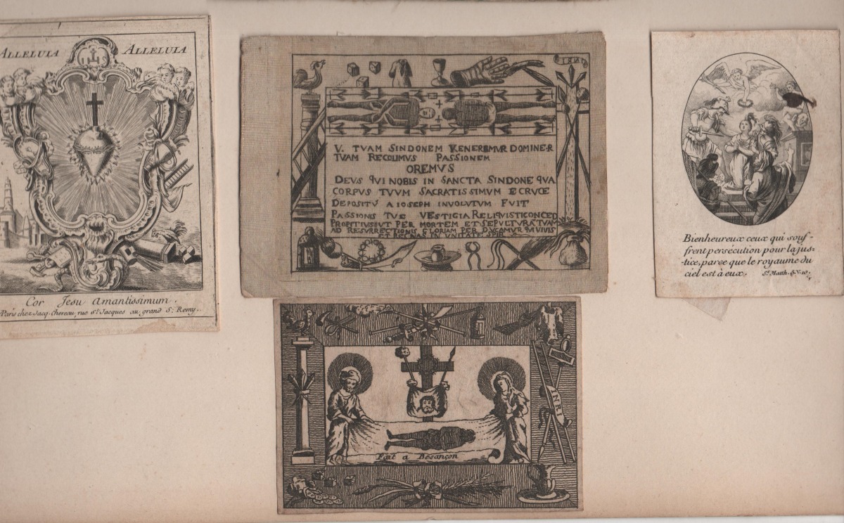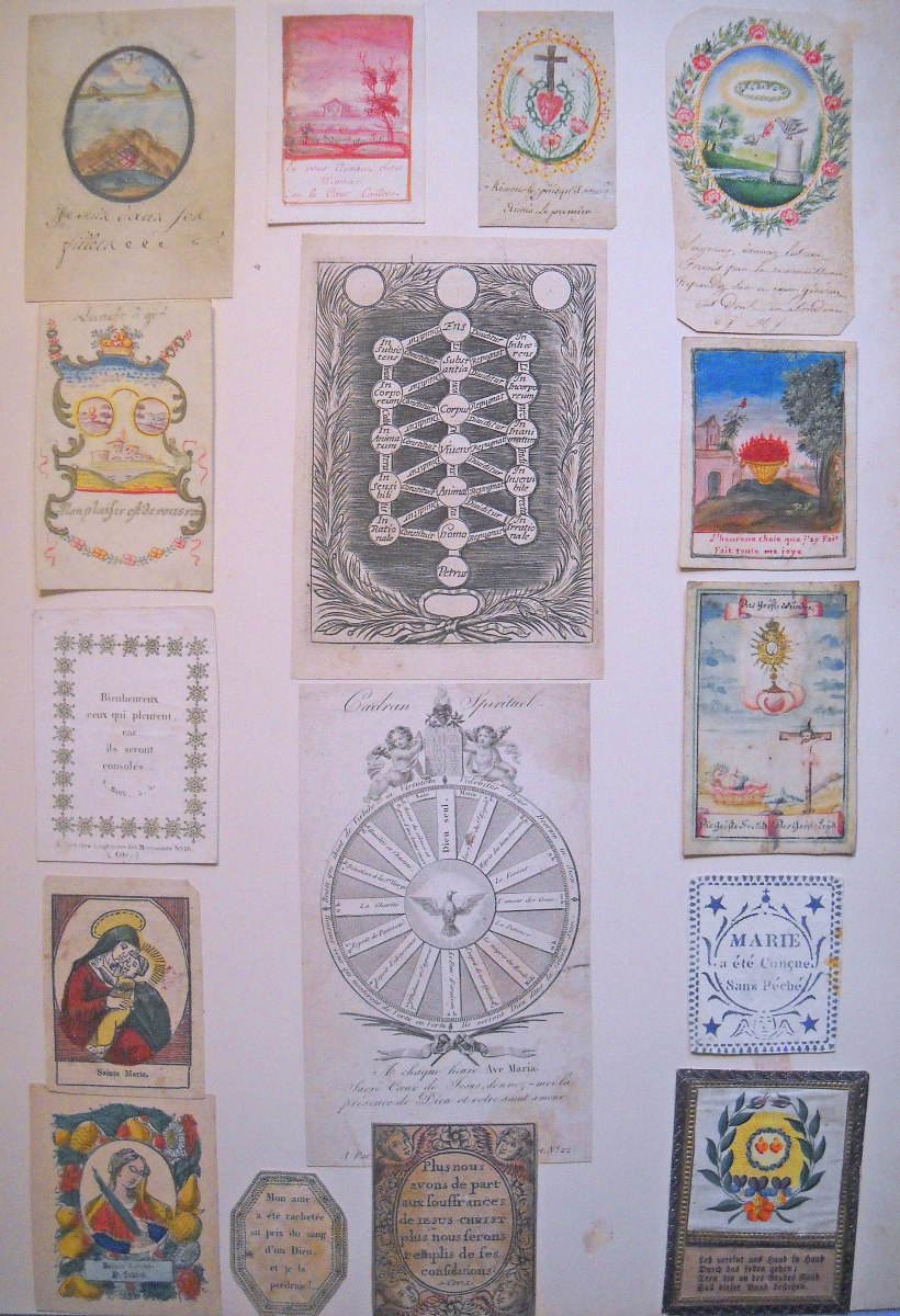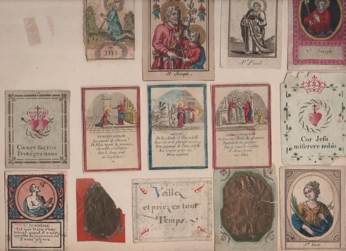 + de 390 images pieuses, en majorité gravure sur cuivre à rehauts polychromes, et quelques pièces entièrement peintes, sur papier vergé, vélin et parchemin. Dont suite de 15 p. Les stations de N.S. en sa passion par Antoine Boudet à Lyon ; maximes et dons ; vignettes ; Notre-Dame de Hanswijk à Malines ; L'intérieur de la Ste Vierge par Pierre MARIETTE ; Notre Dame de Bon Secours ; planche de scènes bibliques en taille douche chez PICARD GUERIN à Caen ; S. Bambino Di Aracoeli ; diverses représentations du Saint Suaire de Besançon dont impression tissée, etc. Contrecollées sur papier épais.