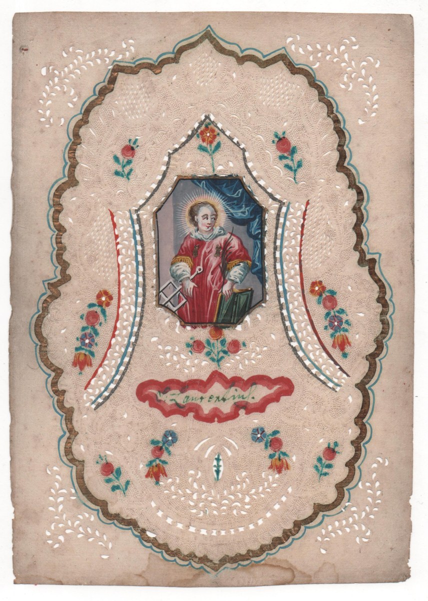 - dans un écusson baroque à double tracé bleu et or sur marge blanche, à décor de fines découpes aux motifs géométriques, de picoté, de lignes et de fleurs peintes, un médaillon central de forme octogonale à décor finement peint représentant sainte Apolline sur un fond azur auréolée de jaune, vêtue d'une chape rouge, d'un corsage bleu sur une robe jaune, elle tient dans sa main droite la palme du martyr et dans sa main gauche une tenaille évoquant sa passion. Cartouche cerné de rouge et de rose portant l'inscription en lettres vertes S. Laurentius. 21,5 x 15 cm. Piqûres et mouillures.