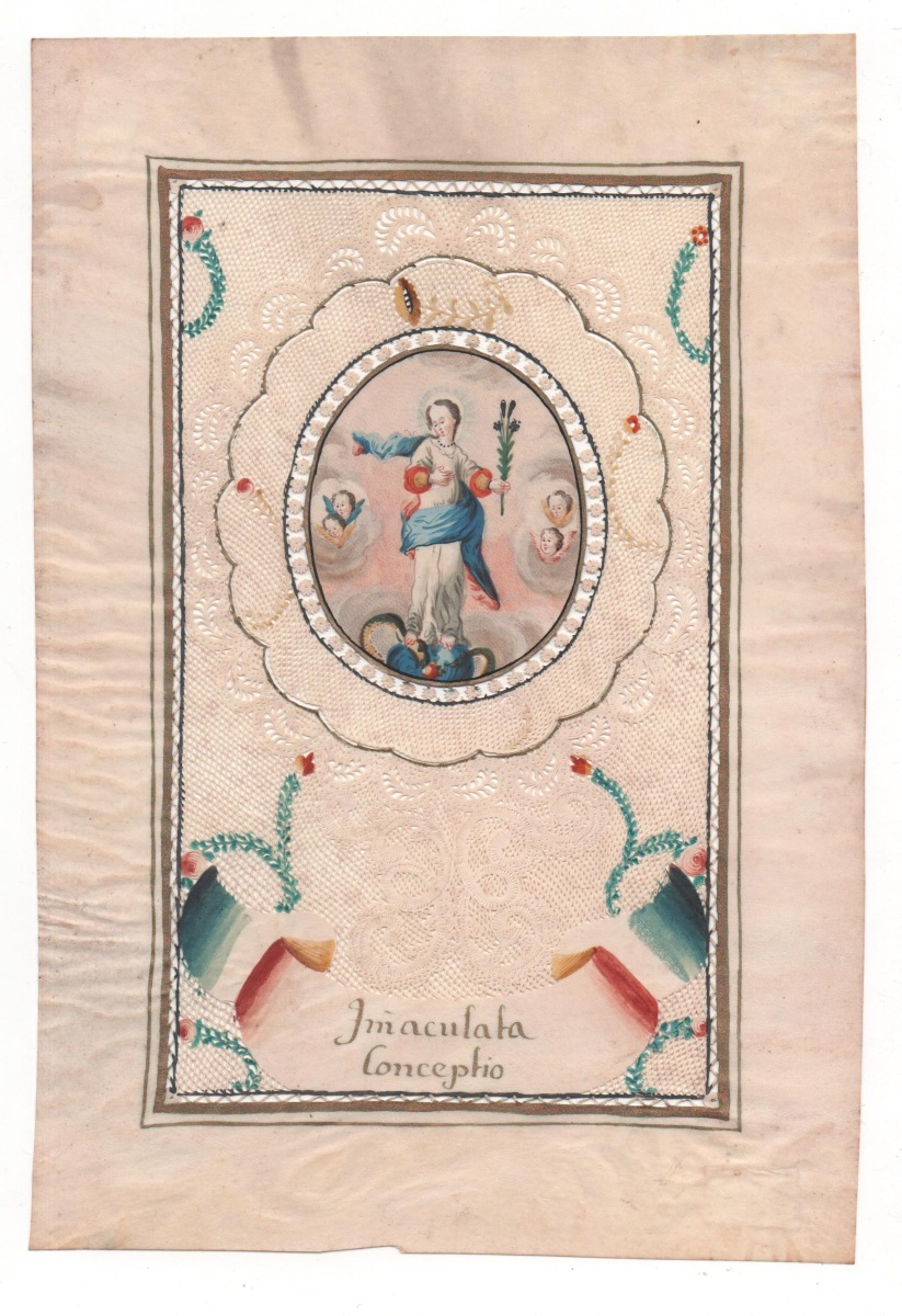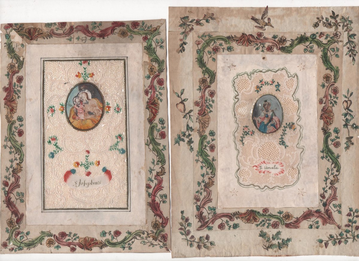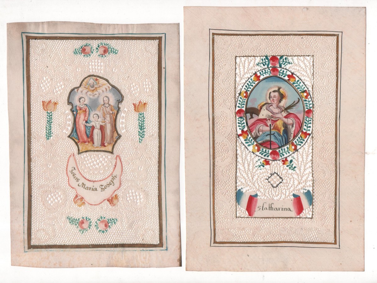 5 canivets sur vélin à riche décor de découpes à réseau de Valenciennes, volutes, fleurs peintes et autres motifs géométriques représentant la sainte Famille (19 x 13 cm), l'Immaculée Conception (21 x 14 cm), sainte Catherine (20 x 13 cm), sainte Ursule (20,5 x 16 cm) et saint Joseph et l'Enfant Jésus (19 x 13,5 cm). Dont deux pièces montées dans un encadrement en papier à décor floral imprimé et rehaussée de coloris d'époque. Petits accidents et manques.