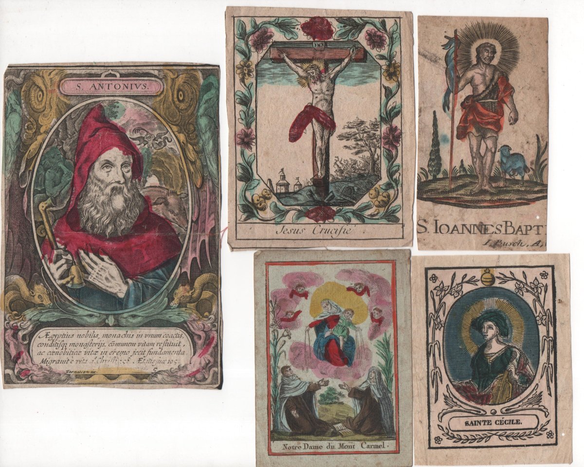 Lot de + de 190 images pieuses sur papier, gravées en taille d'épargne ou en taille douce, certaines rehaussées de coloris d'époque.