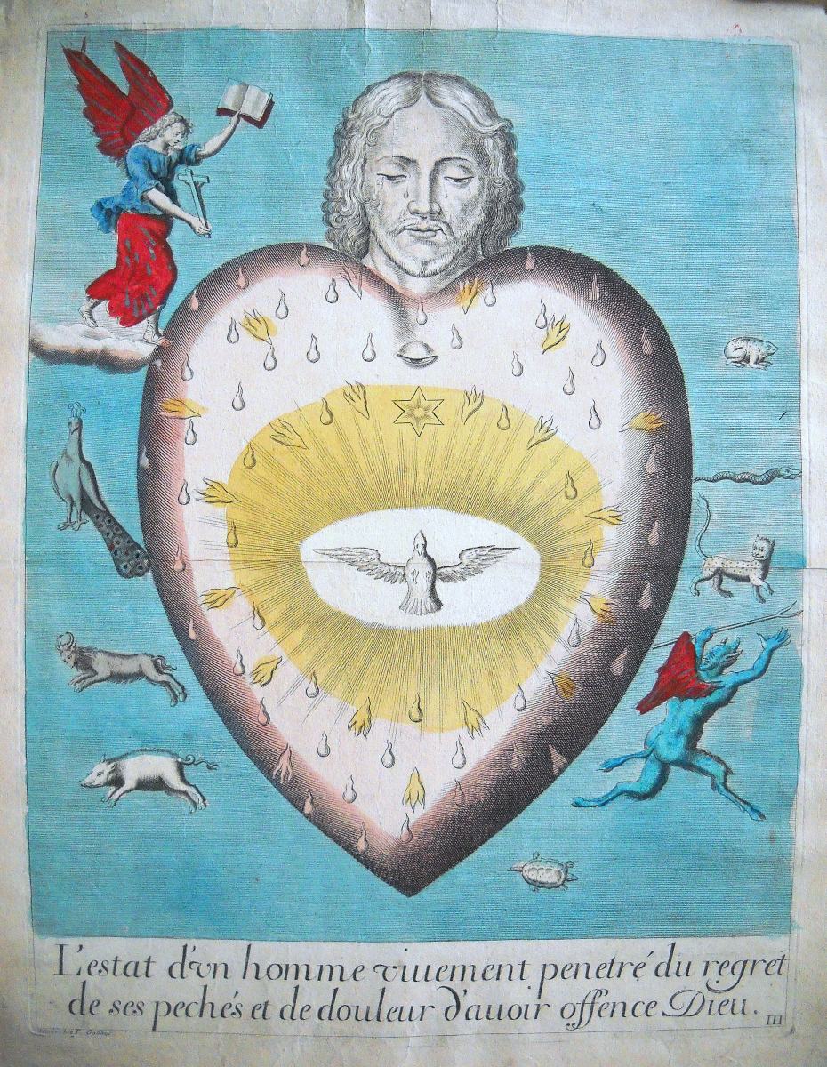 6 épreuves sur papier vergé gravées en taille-douce et rehaussées de coloris d'époque, signées en bas à gauche, A Paris, chez P. Gallays [actif de la du fin XVIIe siècle à 1749] : " l'estat d'un homme dans le peché et qui ny pense pas, au contraire pense à toutes autres choses qui se presentent à ses yeux à son esprit " pl. num. I ; " l'estat d'un homme qui pense serieusement au mauvais estat de sa conscience, et qui commence a en estre touché " pl. num. II ; " l'estat d'un homme vivement penetré du regret de ses pechés et de douleur d'avoir offence Dieu " pl. num. III ; " l'estat d'un homme qui faict penitence et qui en pratique les uvres qui sont les prieres, les aumones et les jeunes " pl. num. IV ; " l'estat d'un homme qui ayant quitté ses pechés se relache de ses bonnes resolutions et se laisse vaincre par les tentations du diable, du monde, et de la chair " pl. num. VI ; " l'estat d'un homme dans lequel le diable estant rentré victorieux avec 7 autres diables, ils y establissent leur demeure " pl. num. VII. 69 x 50 cm. Bon état (manque pl. V). Quelques froissures, traces de plis et mouillures. Très rare.