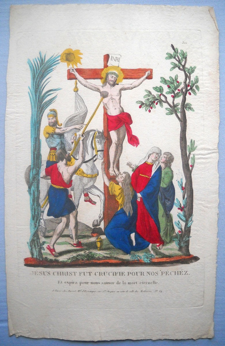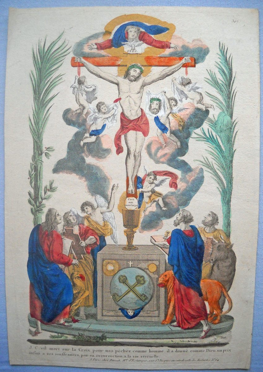 13 estampes gravées en taille-douce sur papier vergé et rehaussées de coloris d'époque, ayant pour thème principal la Crucifixion, 42 x 27 cm.