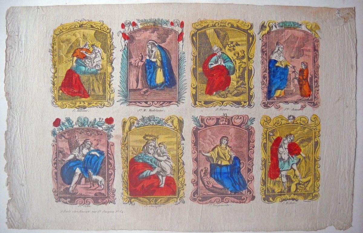 Réunion de 37 planches à compartiments d'images religieuses gravées en taille-douce en majorité sur papier vergé et la plupart rehaussées au coloris d'époque : planches de saintetés, personnages et scènes bibliques. Certaines planches contrecollées sur papier épais. Env. 42 x 27 cm.