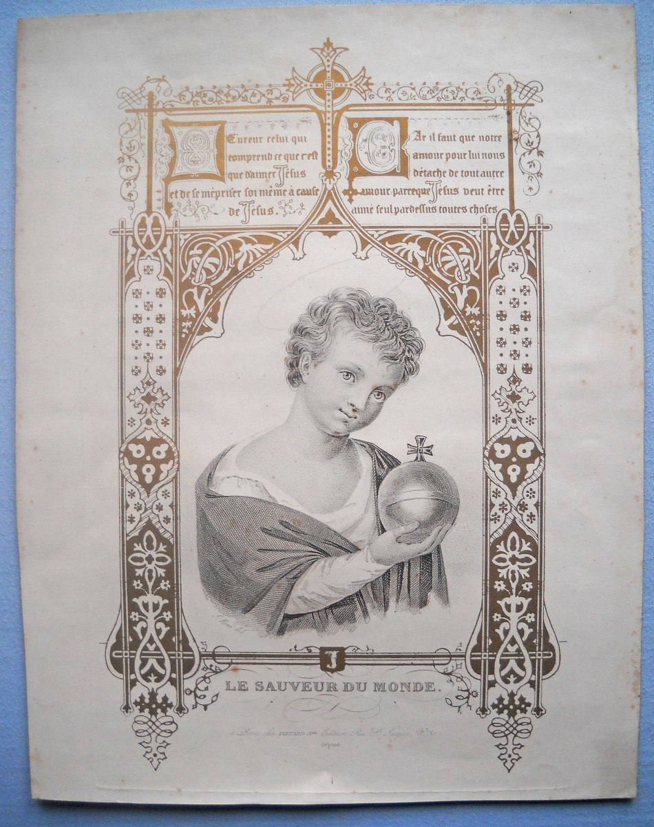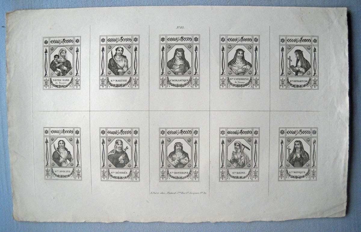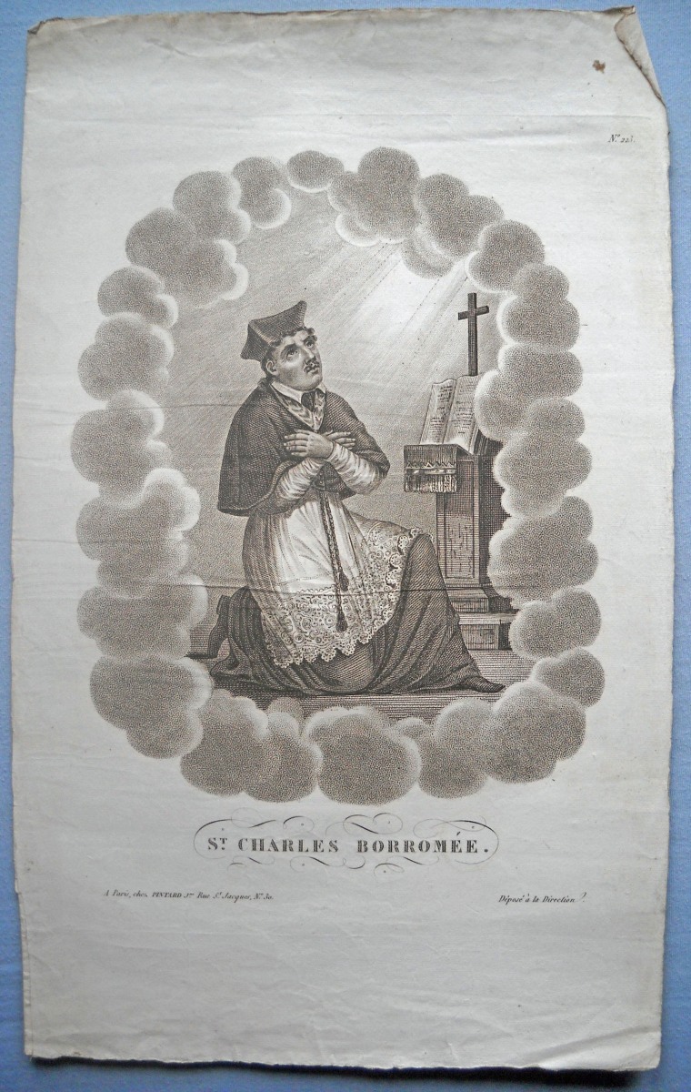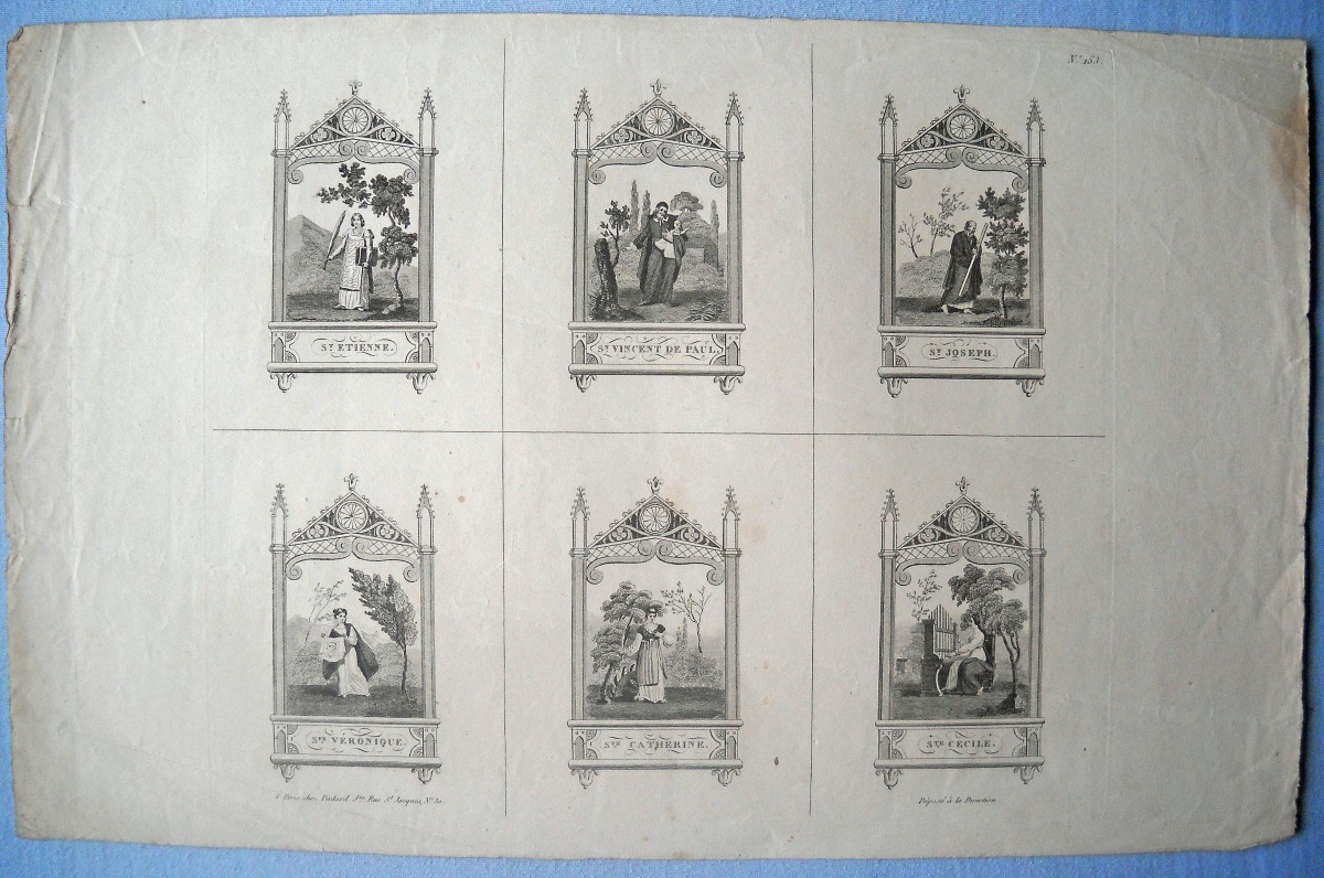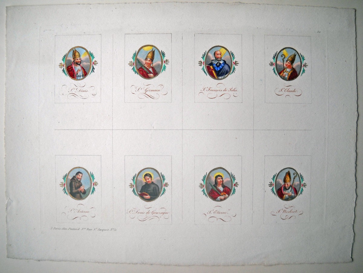 23 estampes gravées en taille-douce ou lithographiées, sur papier vergé ou papier simple, dont 2 p. rehaussées au coloris d'époque, formats divers, la plupart contrecollées sur papier épais ou entoilées, dont : 5 planches d'images pieuses à découper ; St Charles de Borromée, 44 x 27 cm ; St Louis de Gonzague, 33,5 x 28 cm ; Ste Anne instruisant la Ste Vierge, 36,5 x 28 cm ; 10 lithographies extraites de la Galerie du Chrétien, 41 x 30 cm ; 3 planches d'images pieuses à découper ; Adoration de la Croix et Le Sauveur du Monde, 37 x 28,5 cm.