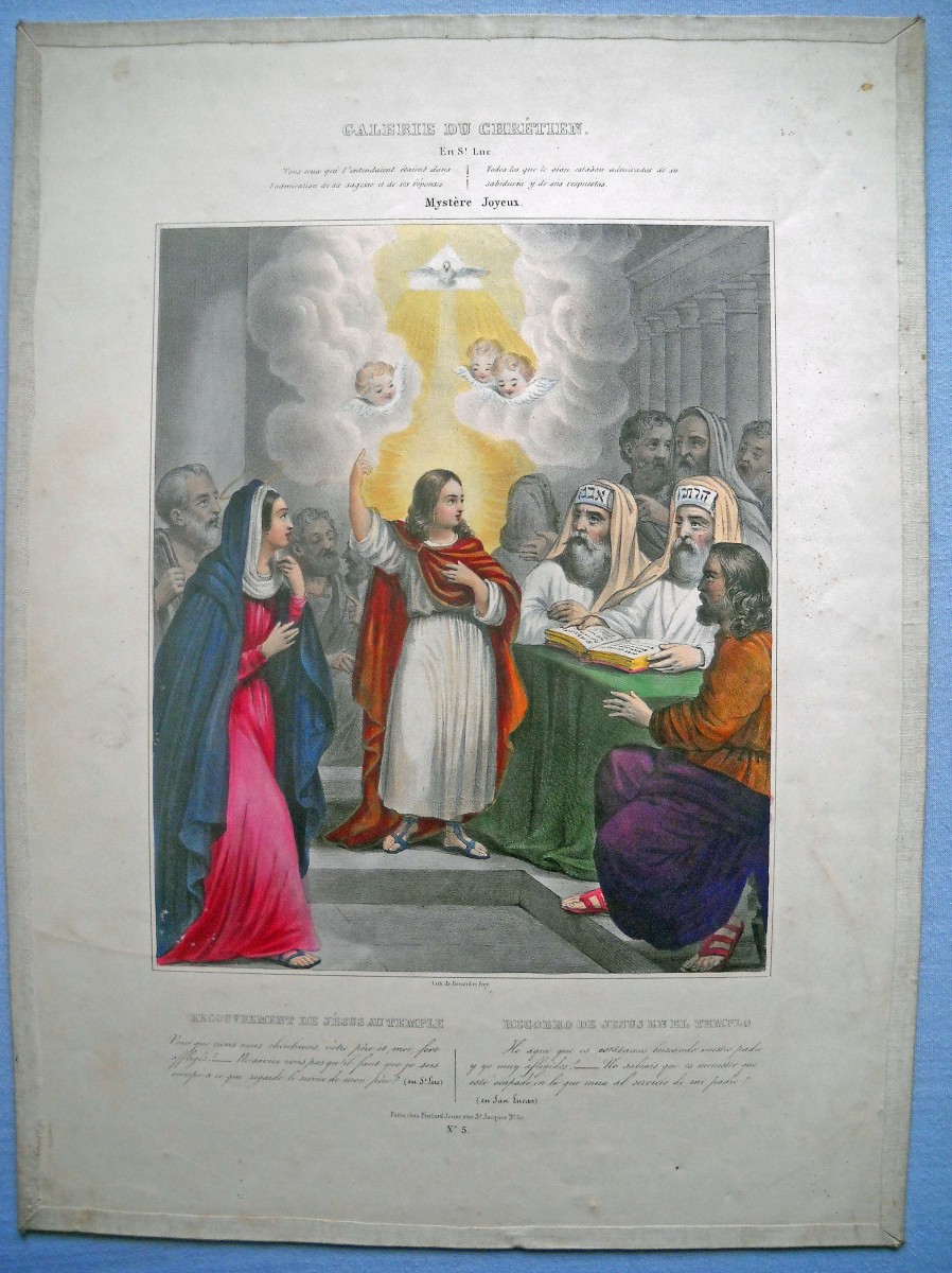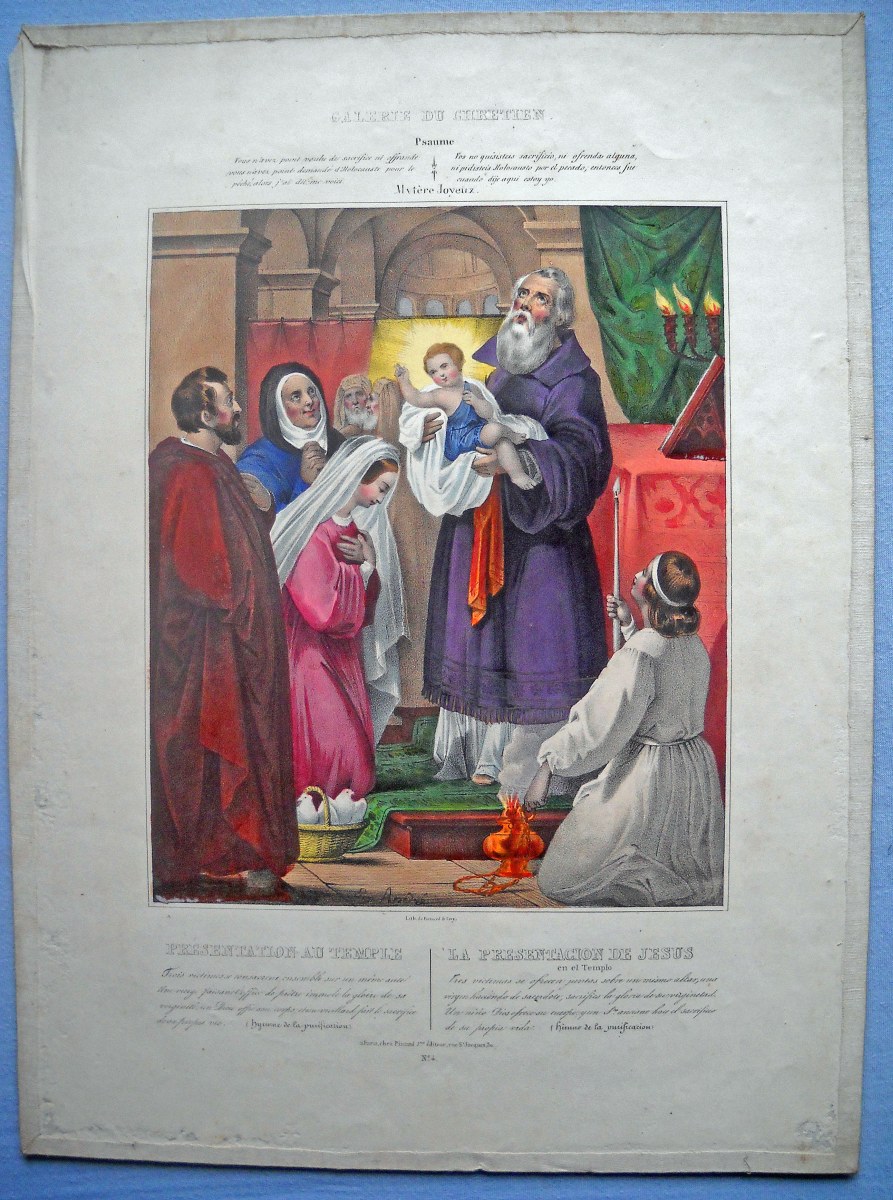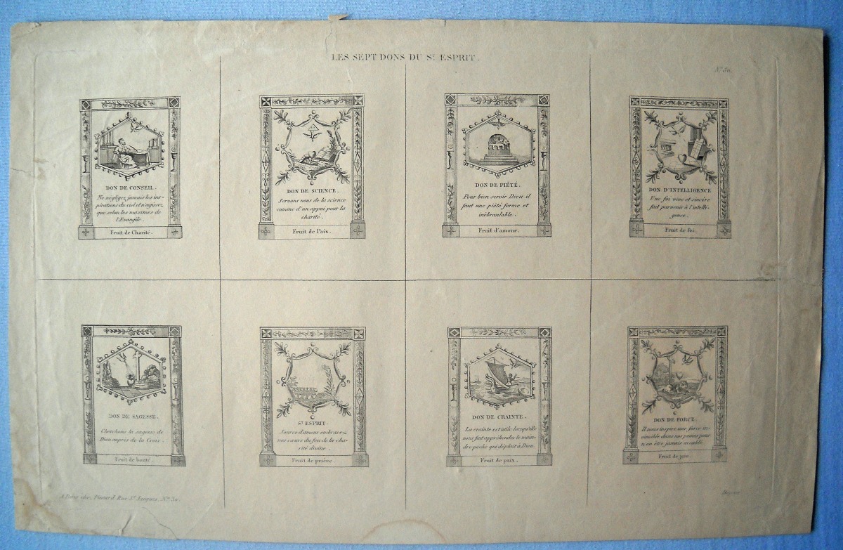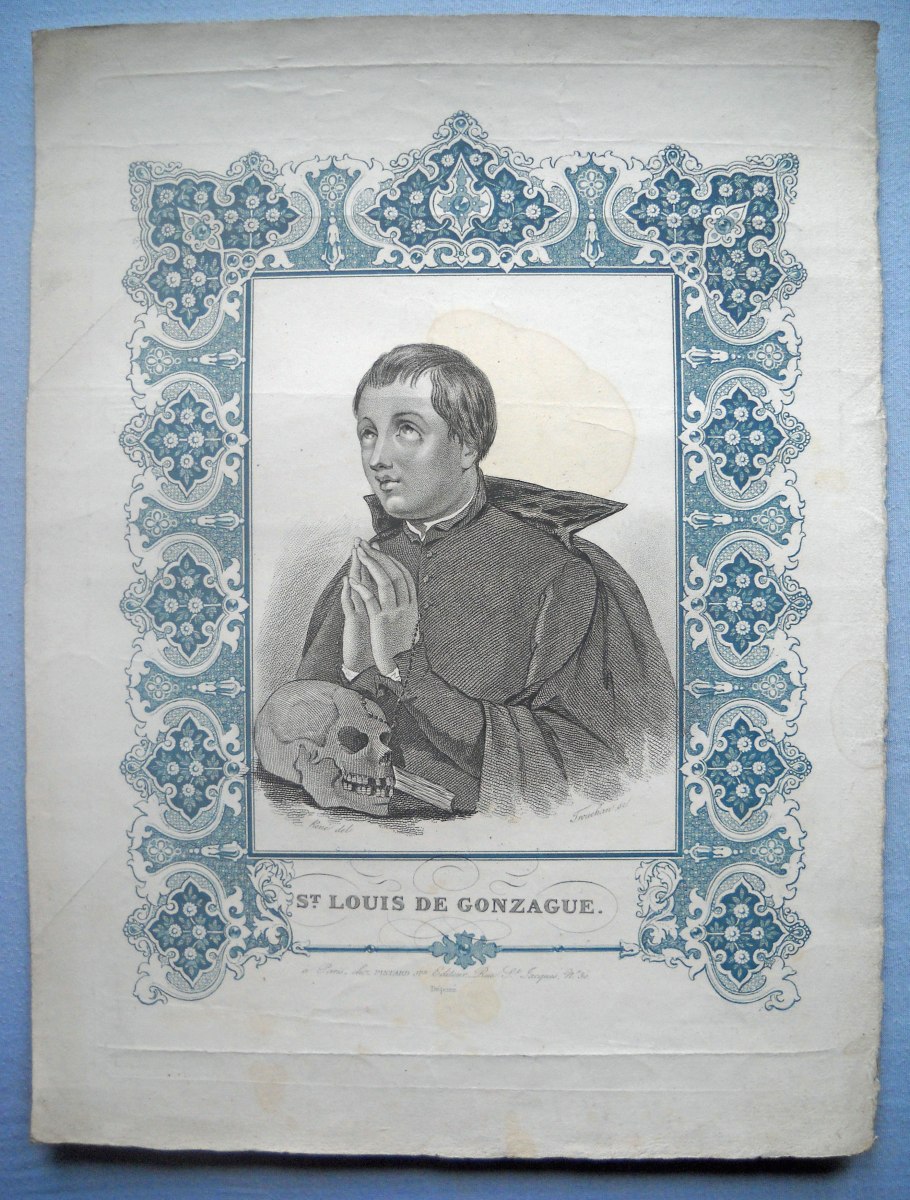23 estampes gravées en taille-douce ou lithographiées, sur papier vergé ou papier simple, dont 2 p. rehaussées au coloris d'époque, formats divers, la plupart contrecollées sur papier épais ou entoilées, dont : 5 planches d'images pieuses à découper ; St Charles de Borromée, 44 x 27 cm ; St Louis de Gonzague, 33,5 x 28 cm ; Ste Anne instruisant la Ste Vierge, 36,5 x 28 cm ; 10 lithographies extraites de la Galerie du Chrétien, 41 x 30 cm ; 3 planches d'images pieuses à découper ; Adoration de la Croix et Le Sauveur du Monde, 37 x 28,5 cm.