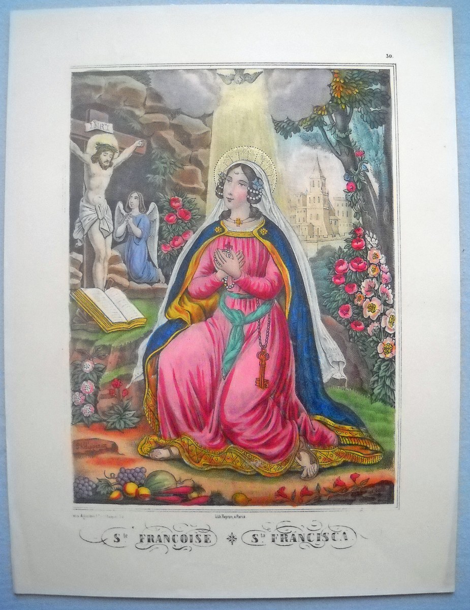 38 estampes lithographiées à thème religieux, la plupart rehaussées de coloris d'époque, env. 43 x 29 cm, dont : Hommage aux sacrés curs ; La Présence de Dieu ; Les mystères du Rosaire ; Notre Dame de Grâce ; Ste Appoline ; Ste Catherine ; Sainte Julie ; Adoration des mages ; La présentation de la Ste Vierge au Temple ; St Victor ; St Crépin et St Crépinien ; etc.