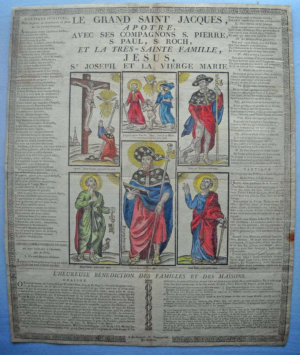 Belle et grande épreuve gravée sur bois, sur papier vergé, portant pour titre : Le Grand Saint Jacques, apotre avec ses compagnons S. Pierre, S. Paul, S. Roch, et la Très-Sainte Famille, JESUS, St Joseph et la Vierge Marie, ornée de personnages bibliques coloriés et illustrée de cantiques et d'une oraison : L'heureuse bénédiction des familles et des maisons. Inscrit en bas au centre A St Jacques, de l'imprimerie des Pélérins. 48,5 x 40,5 cm.