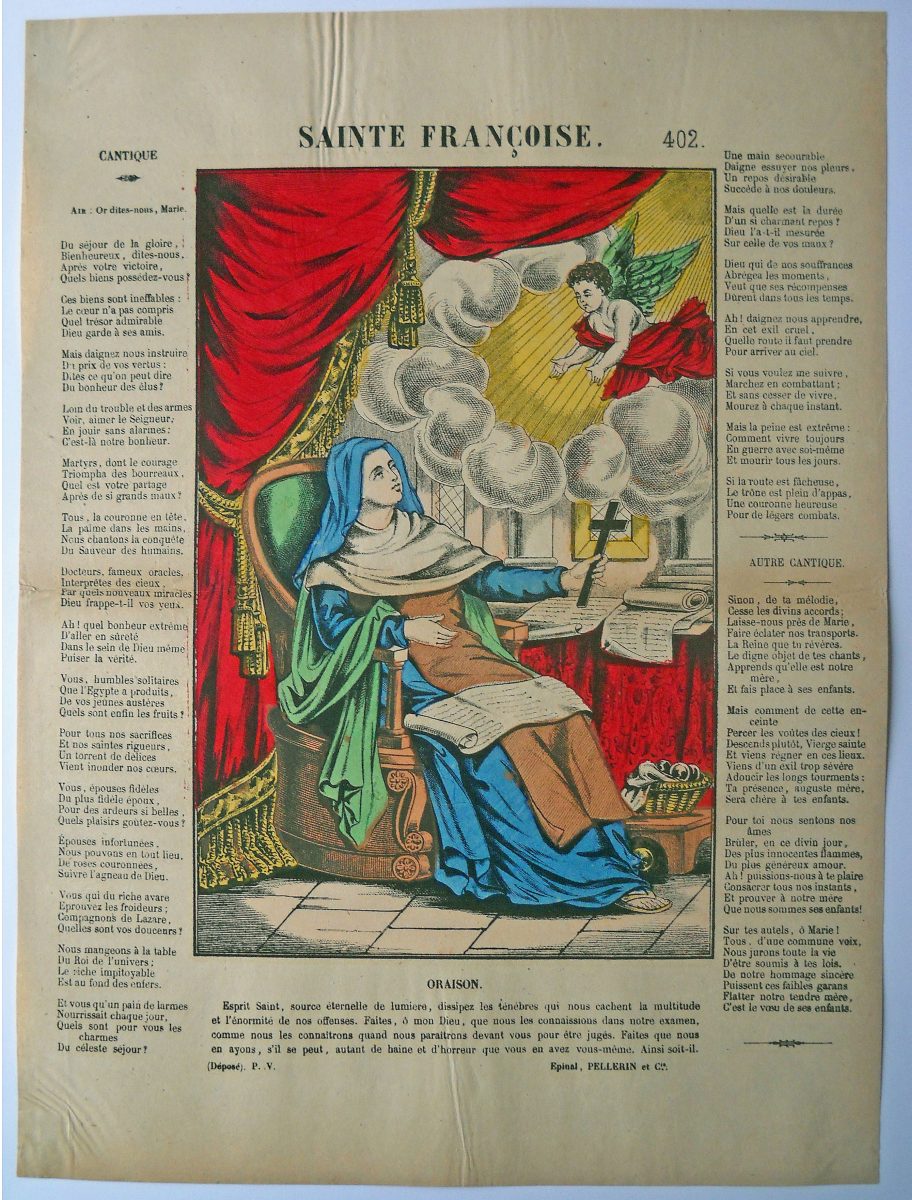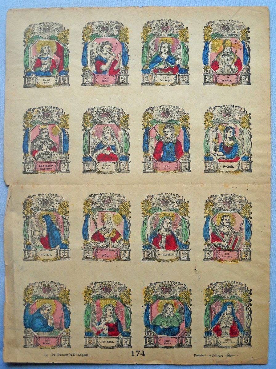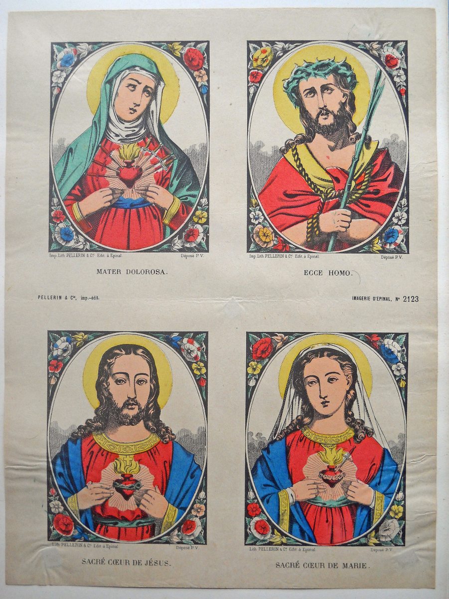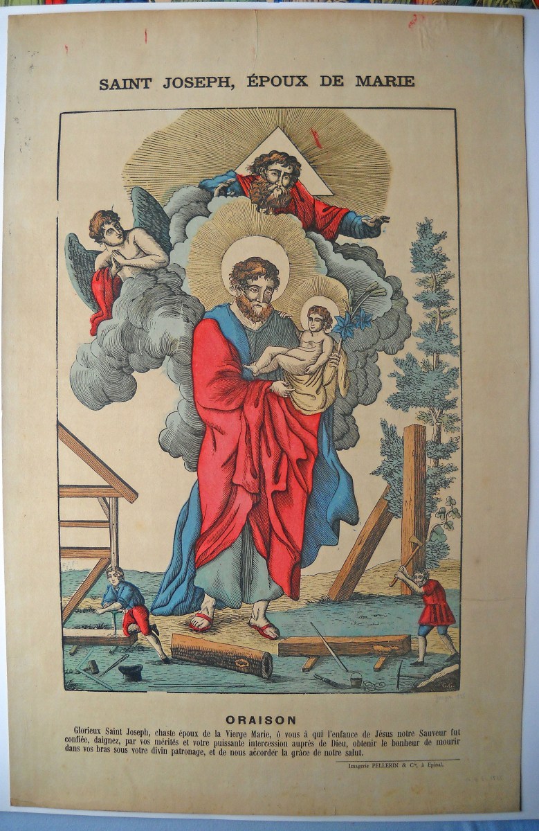 72 épreuves, gravure sur bois ou lithographie rehaussée au coloris de l'époque, dont 8 montées sur papier épais, toutes dimensions, état B à TB : Mariage de Saint Joseph avec la sainte Vierge, sous les auspices du Saint Esprit 158, 42 x 64 cm ; Saint Joseph, époux de Marie, 64 x 41 cm ; Sainte Hélène ; Sainte Cécile ; Saint Fiacre, patron des jardiniers 329 ; Fuite en Égypte 245 ; Saint Georges 334 ; Sainte Françoise 402 ; Album in-4 à l'italienne, reliure moderne en papiernage, titré " Tirages anciens - Imagerie Pellerin à Épinal N°1 ", contenant 46 planches, lithographie coloriée, sur papier mécanique, 40 x 30 cm, état TB : Noël 1862 ; Sommeil de Jésus 1846 ; Jésus, Marie, Joseph 1866 ; Baptême de N.S. Jésus-Christ 1838 ; La Sainte Cène 1906 ; Le tribunal injuste 1824 ; Calvaire de Jérusalem 1845 ; La robe de N.S. Jésus-Christ 1851 ; Le Christ aux stations 1827 ; L'horloge de la passion 1903 ; Les cinq plaies de N.S. Jésus-Christ 1854 ; Christ ayez pitié de nous 1833 ; Ascension de N.S. Jésus-Christ 1860 ; Véritable portrait de N.S. Jésus-Christ 1807 ; Le très saint sacrement 1865 ; Litanies de la sainte Vierge 2167 ; Sacré Cur de Marie 1801 ; Le mois de Marie 1863 ; Notre-Dame auxiliatrice 248 ; Notre-Dame de grâce 1879 ; Notre-Dame d'Espérance 1892 ; De N.-D. de Liesse 1886 ; Notre-Dame du Mont-Carmel 1880 ; Médaille miraculeuse 1905 ; Apparition de la sainte Bible 1894 ; L'Ange gardien 1895 ; Sainte Julie 1233 ; Sainte Philomène 2103 ; Sainte Victoire 2112 ; Sainte Suzanne 2109 ; Ste Philomène 2071 ; Sainte Rose de Lima 2105 ; Ste Joséphine 408 ; Sainte Louise 2082 ; Saint Donat martyr 2025 ; Bienheureux Gérard Majella 2065 ; Saint Eustache martyr 2066 ; Saint Alexis 2010 ; Christ aux Saintes femmes ; médaille miraculeuse 2115 ; Le roi des rois ; la reine des cieux 2120 ; Le Bon pasteur ; Laissez venir à moi les petits enfants 2121 ; Christ aux anges ; Christ aux saintes 2122 ; 4 planches à compartiments ; etc.