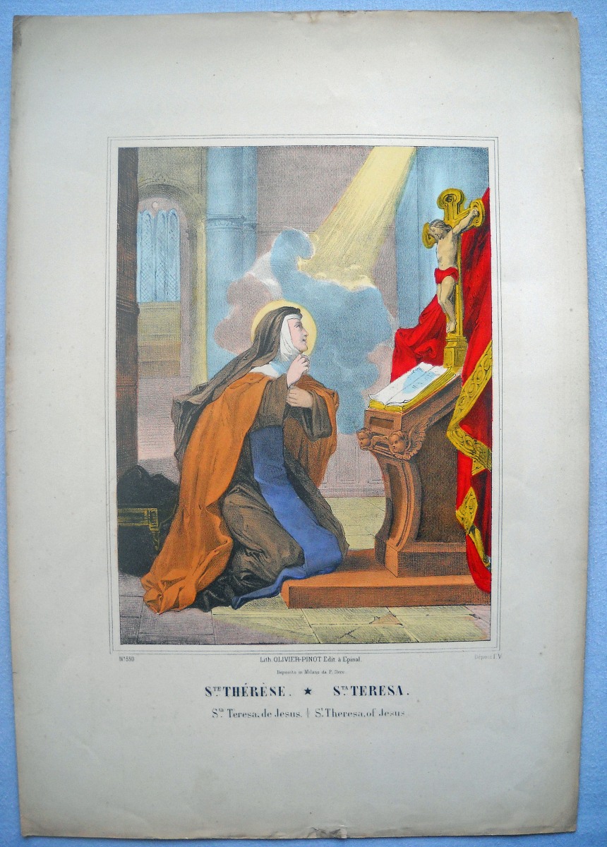 Lot de 29 lithographies rehaussées de coloris d'époque, certaines portant le tampon de colportage, env. 40 x 30 cm, dont : Sainte Adélaïde ; Saint Paul ; Sainte Thérèse ; Procession de Ste Anne d'Auray ; Saint Nicolas ; Sainte Clémence, Jésus-Christ tombe en portant sa croix ; La Cène ; Saint Joseph ; Saint Pierre (3 ex.) ; Sacré cur de Marie ; Saint Jean-Baptiste (2 ex.) ; Sainte Joséphine ; Le martyre de Saint Etienne ; Saint Michel ; Saint Sébastien ; Sainte Agathe ; L'Ange gardien ; La Ste Vierge, l'enfant Jésus et le petit Saint Jean ; Ste Henriette ; Ste Thérèse ; La Sainte Famille ; La Vierge au donataire ; 2 planches à compartiments de saintetés.