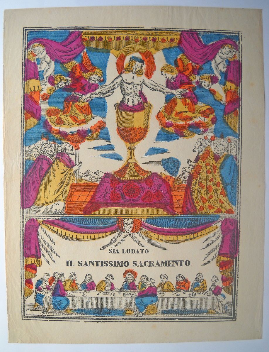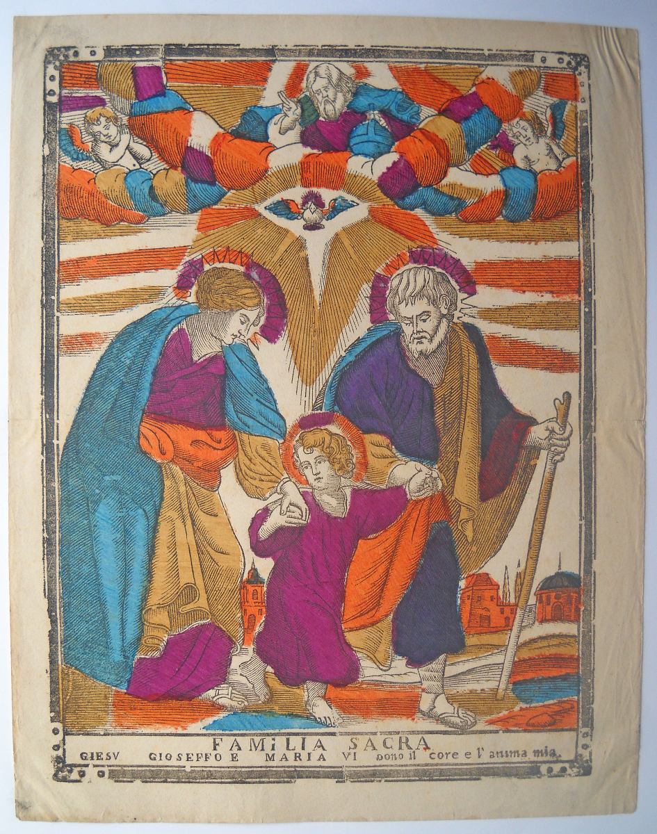9 épreuves, gravure sur bois dont 8 à rehauts de coloris d'époque, montées sur papier épais, env. 44 x 34 cm dont 3 planches à compartiments de saintetés ; Familia sacra ; La devotissima Madonna Di S. Luca di Bologna ; B. V. di Caravaggio ; Sacro Cuor di Maria ; B.V. del Carmine co' miracoli ; Sia Lodato Il Santissimo Sacramento.