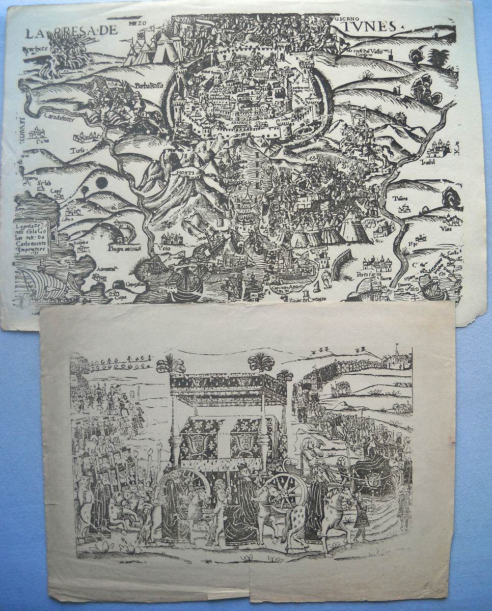Lot de + de 40 épreuves gravées sur bois, la plupart sur papier vergé, petits et grands formats (in-12 à grand in-fol.). Réimpressions de bois anciens des XVIe, XVIIe et XVIIIe siècles, en majorité des uvres d'artistes italiens, dont planches de décorations pour ornementation de couvertures de caissons, tapisseries ; sujet d'éventail ; Arboro di frutti della fortuna [L'Arbre de la Liberté] ; Il moro e la mora ; Soltan Charadi ditto Barbarossa re d'Algeri ; Il paladin Astolfo ; Il conte Orlando Paladino ; La Bella Marfisa ; Riciardetto Fratello Dirina Doda Monte Albano, etc.