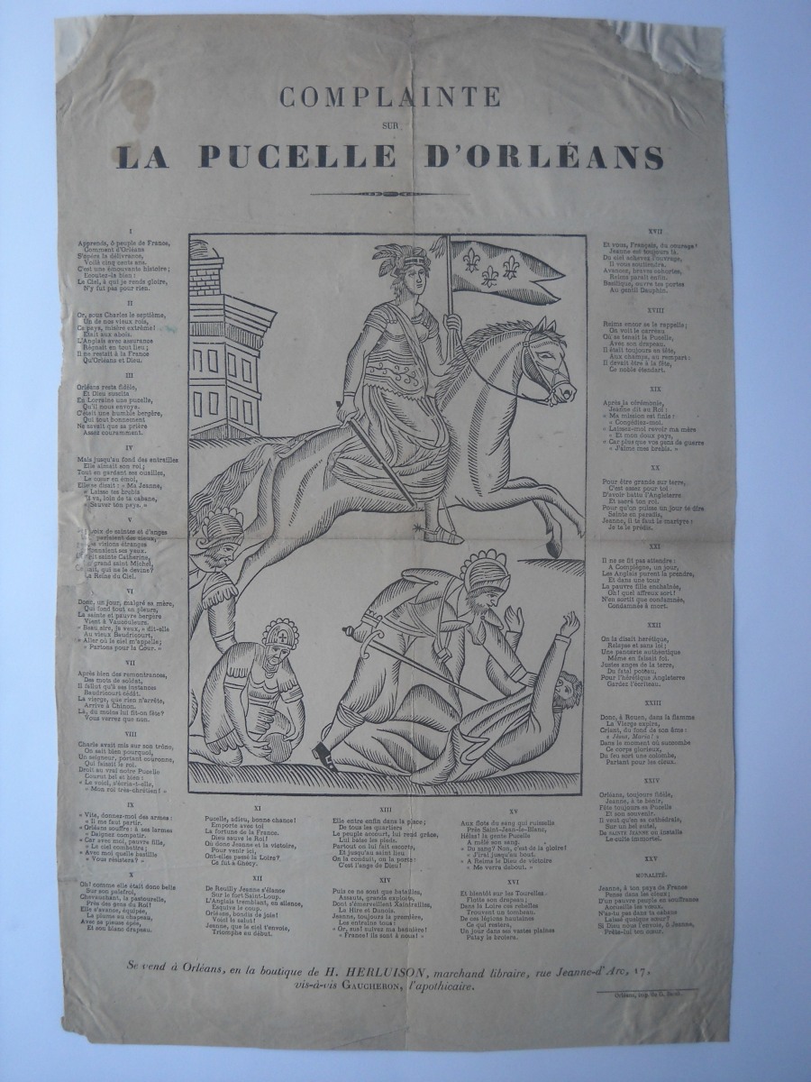 , gravure sur bois coloriée au pochoir, papier vergé, montées sur papier fort, 28 x 37,5 cm ; Complainte sur la pucelle d'Orléans, seconde moitié du XIXe siècle, 32 x 49 cm. En l'état.