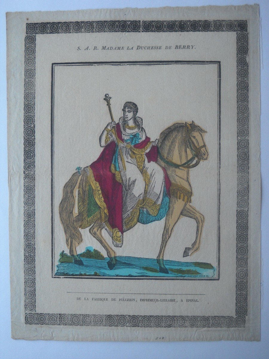 5 épreuves, gravure sur bois coloriée au pochoir, montées sur papier épais : Retraite de Moscow, gravée par Réveillé, 31,5 x 41,5 cm [ca 1812-1815] ; S.A.R. Madame la duchesse de Berry, gravée par Canivet fils, 41,5 x 31,5 cm [ca 1816-1822] ; Degrés des âges, 30 x 43 cm [ca avant 1822] ; Mort et convoi de l'invincible Malborough, 42,5 x 32 cm [ca 1825] ; Histoire de Damon et Henriette, 41 x 65 cm [ca 1828].