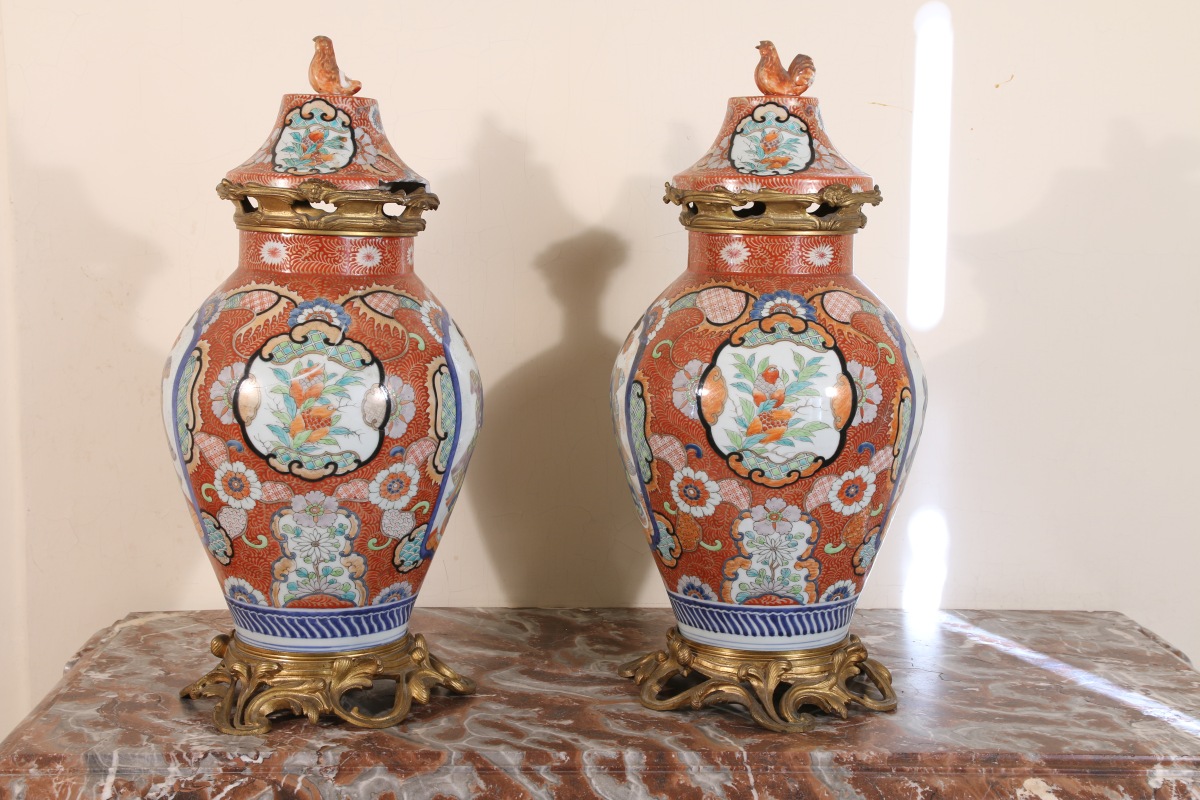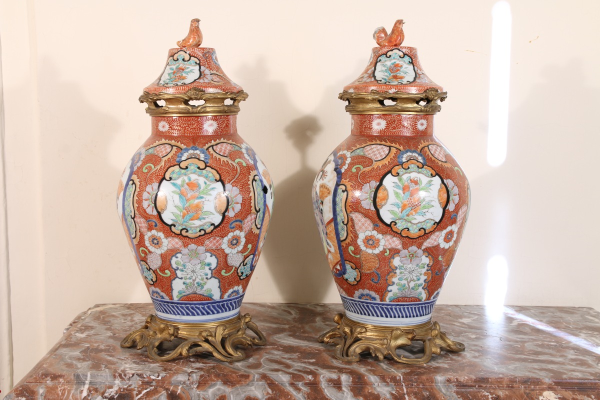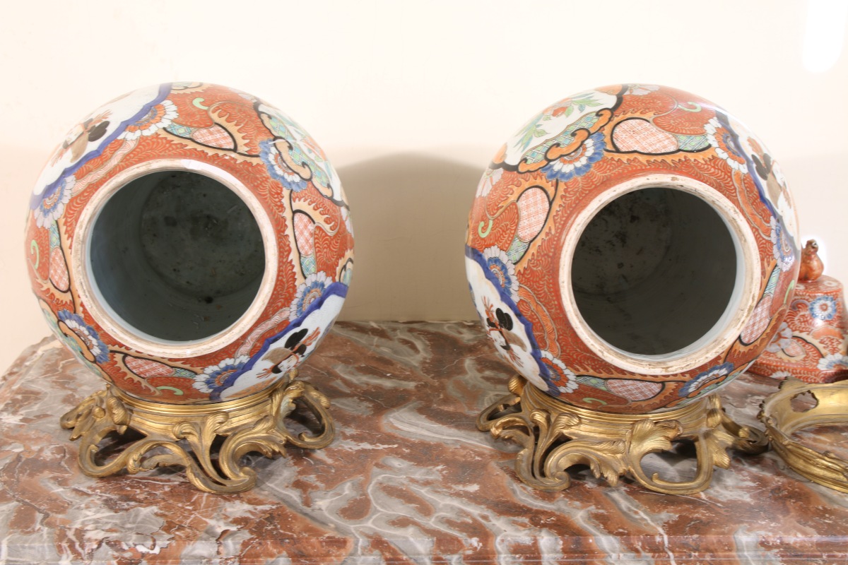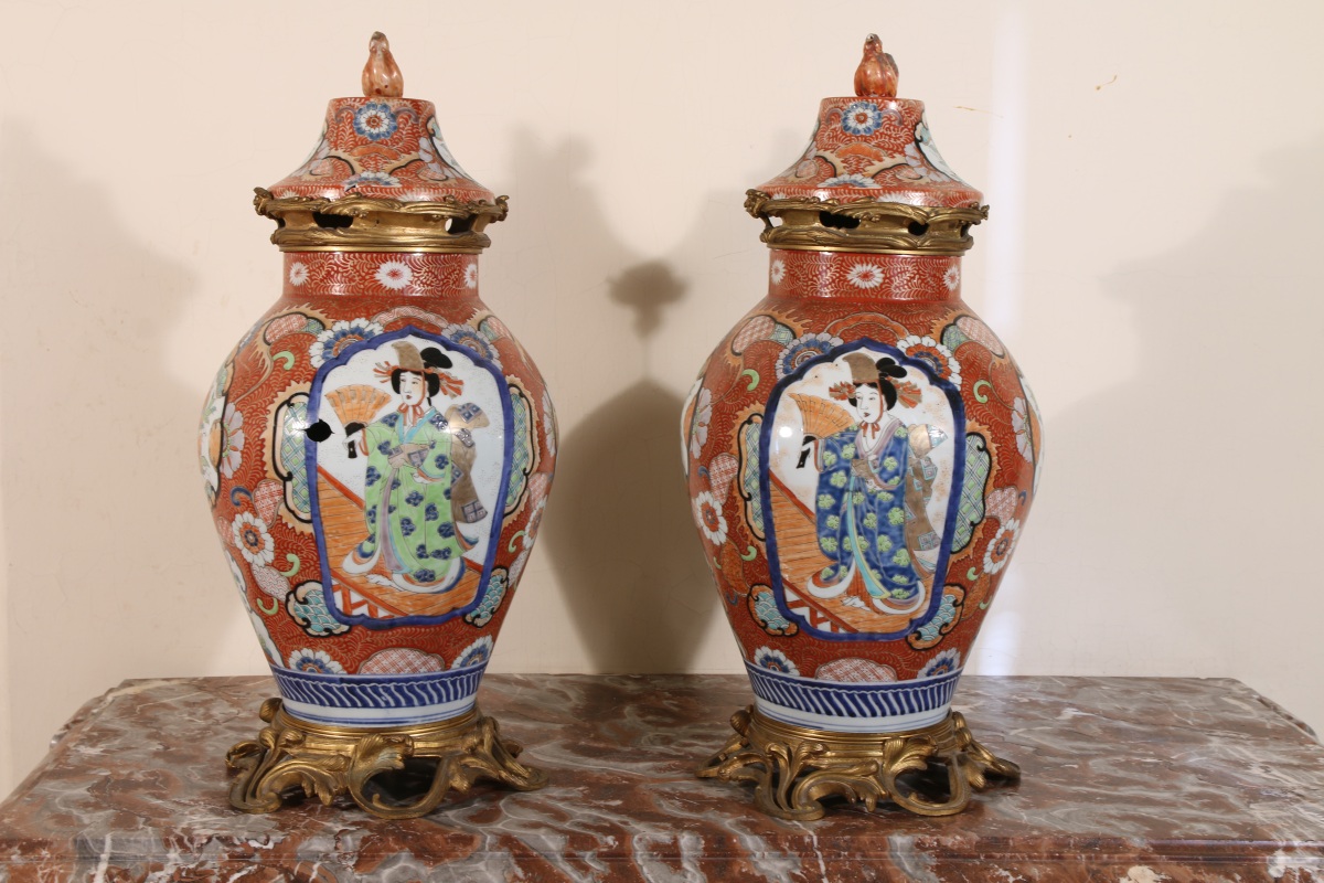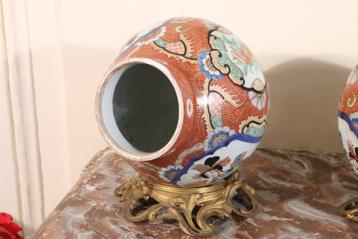 JAPON. Paire de POTICHES en porcelaine montée.