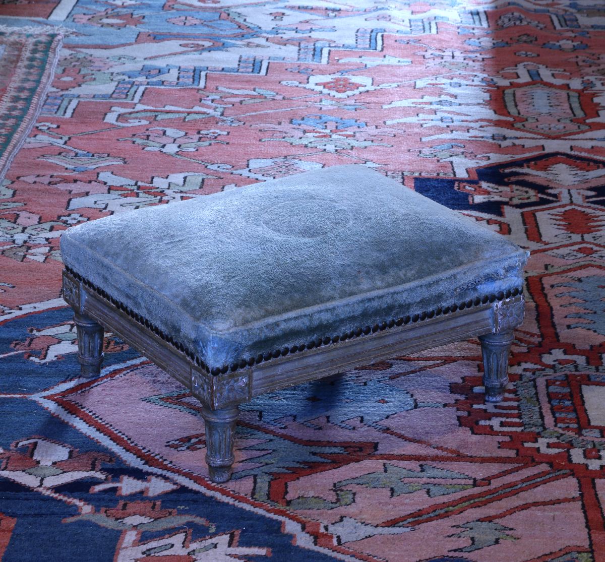 BOUT DE PIED en bois mouluré, sculpté et laqué gris. Dés de raccordement à fleurons. Pieds fuselés et cannelés.