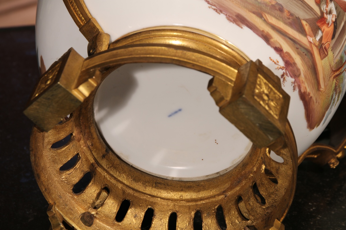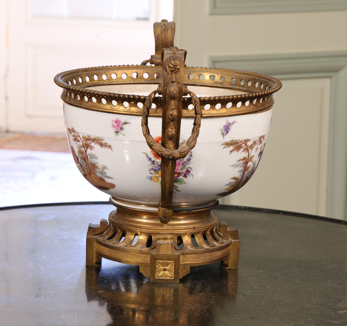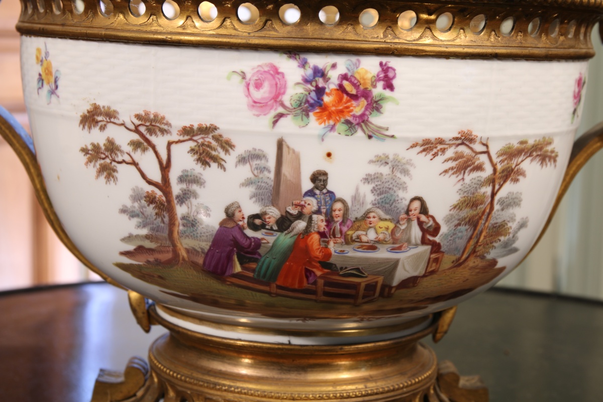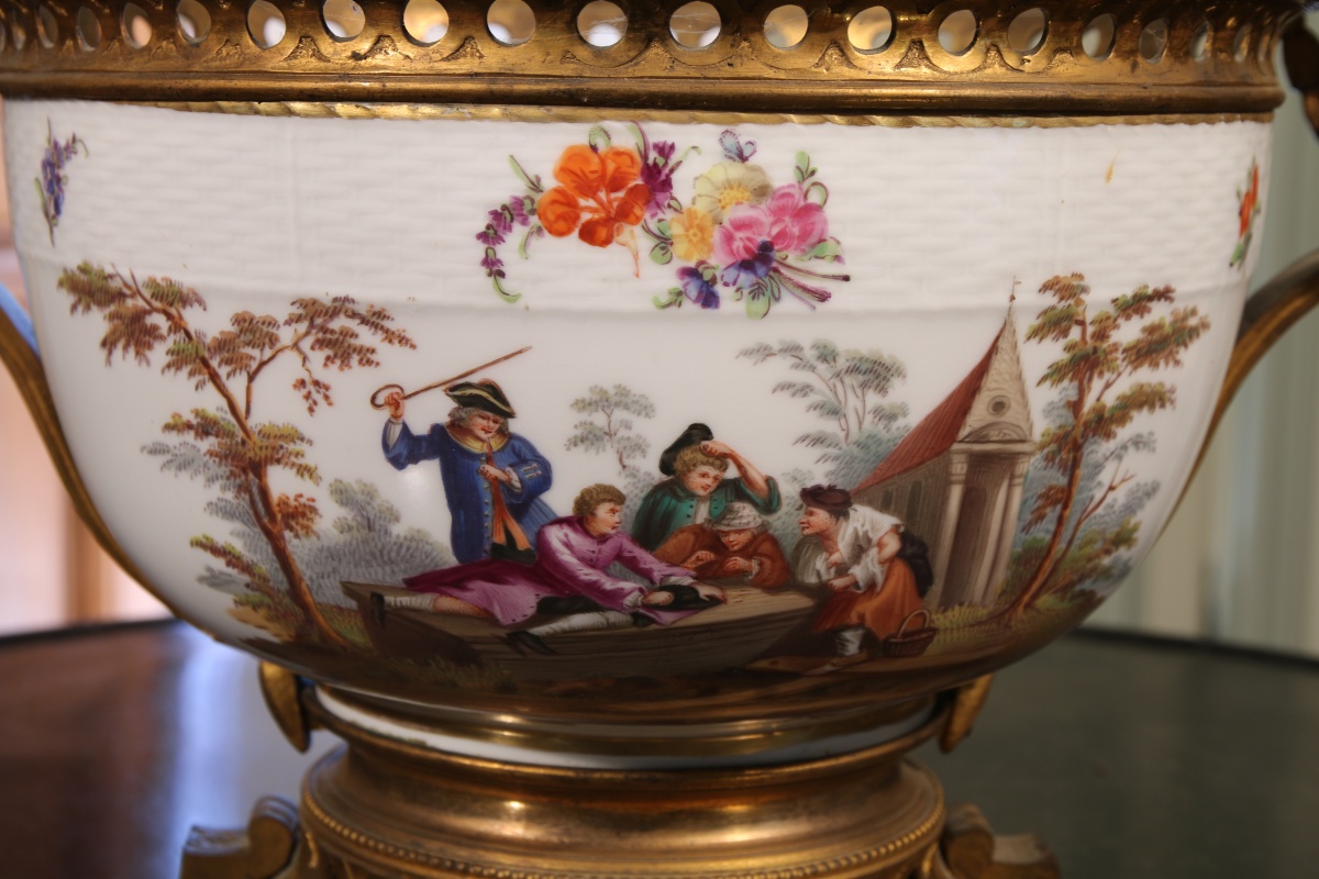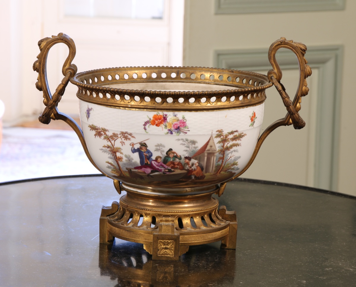 BERLIN. Important CACHE-POT en porcelaine à décor polychrome sur fond paysagé de personnages attablés d'un côté et jouant (?) de l'autre. Bordure moulée d'un motif à l'imitation de la vannerie. Riche monture en bronze ciselé et doré à décor ajouré de style Louis XVI tel que frises d'oves, rais de perles et dés fleuronnés. Les anses latérales agrémentées de guirlandes de lauriers.