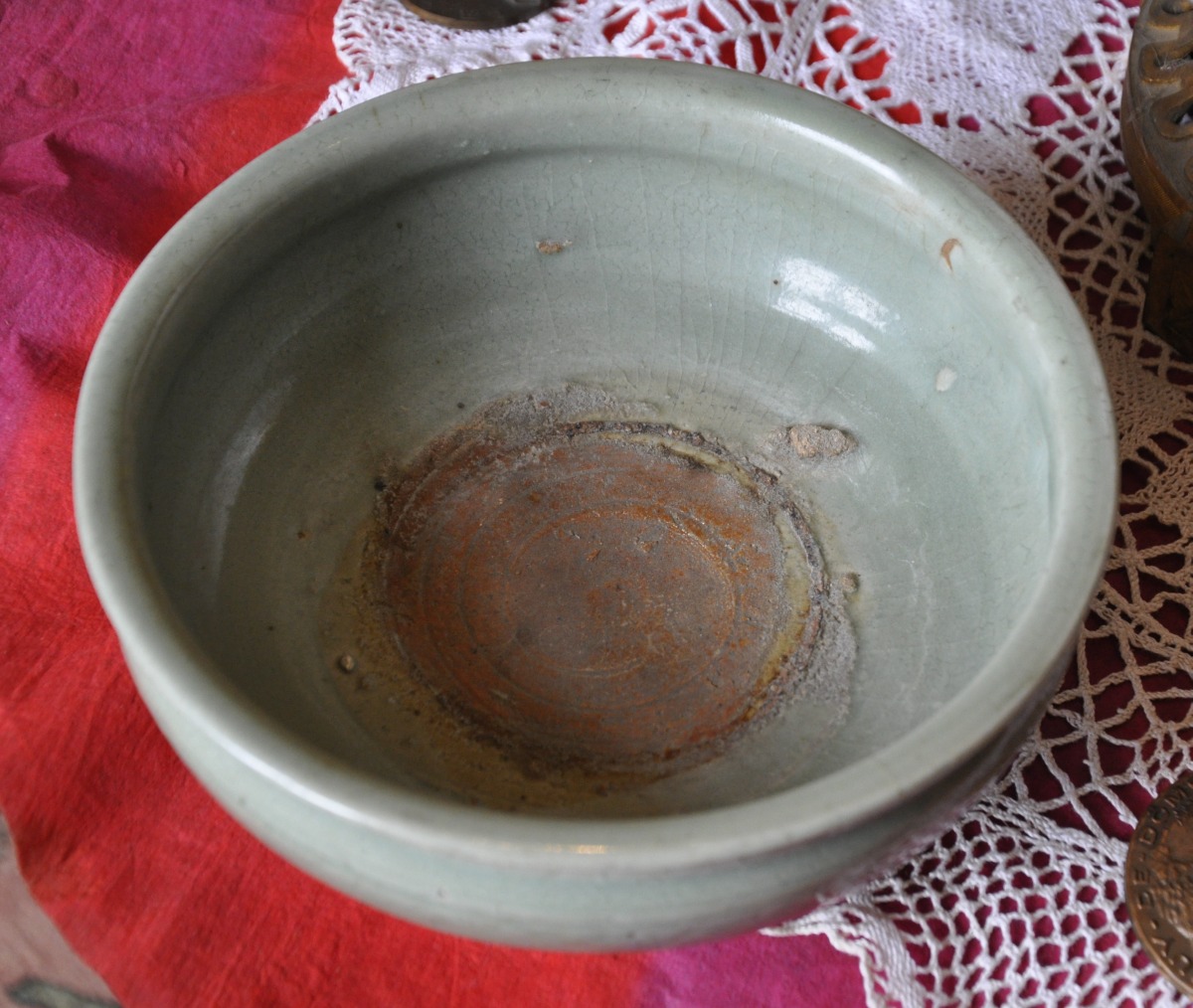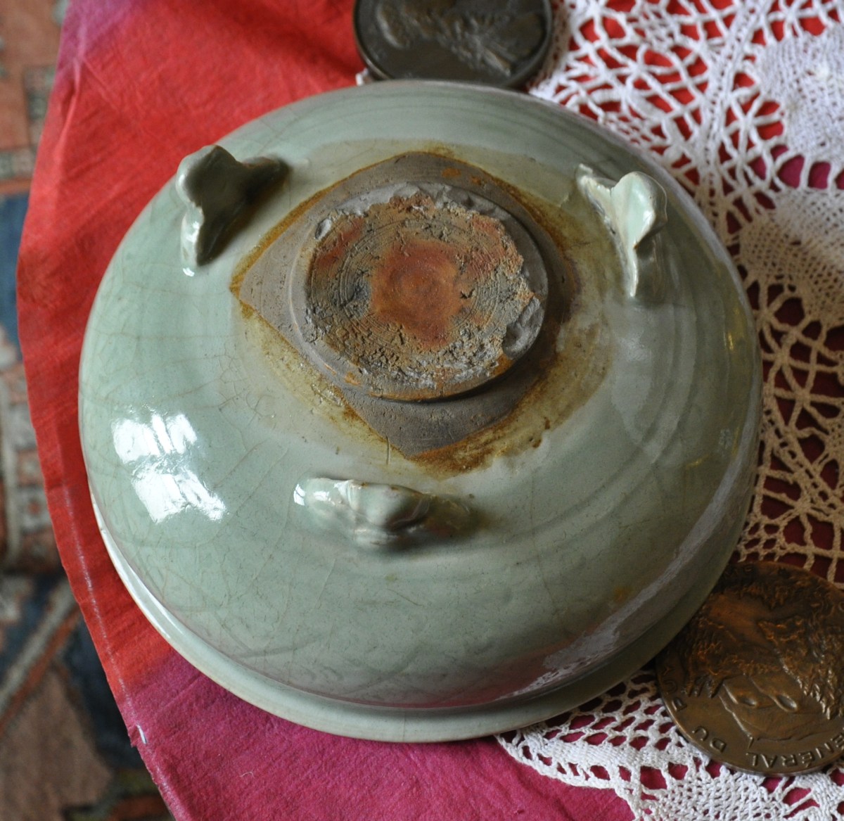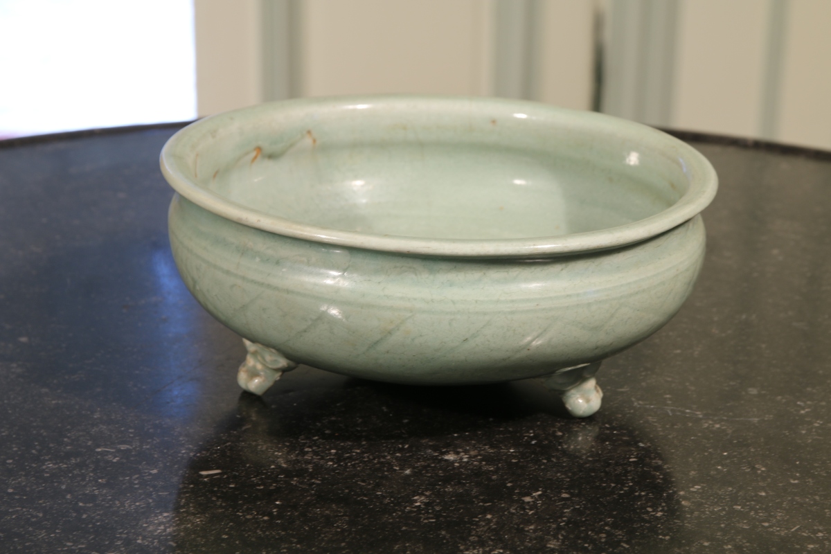 CHINE. COUPE tripode en grès émaillé vert céladon. Décor de croisillons.