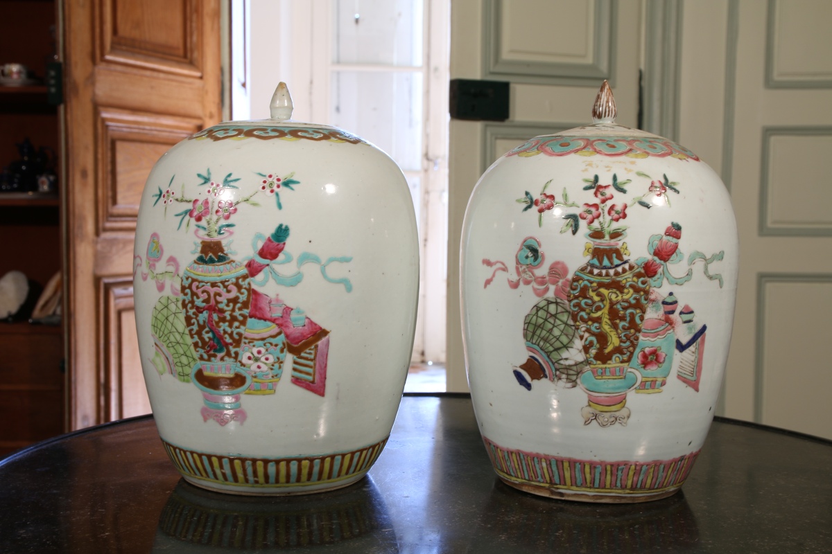CHINE. Paire de POTS À GINGEMBRE à décor polychrome dit à l'échantillon.