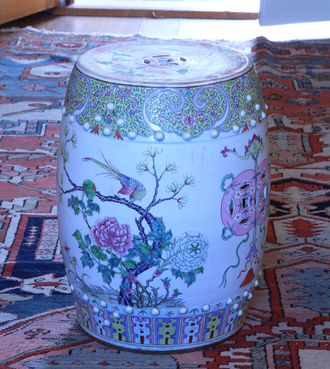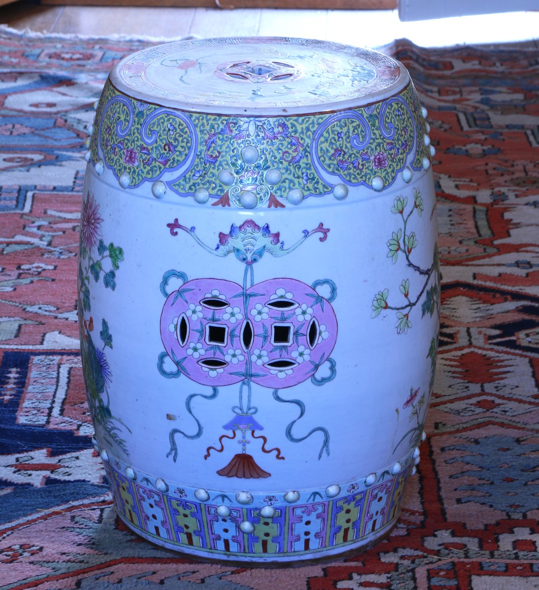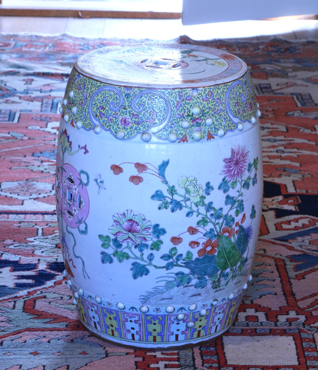 CANTON. TABOURET dit tambour à riche décor floral polychrome.