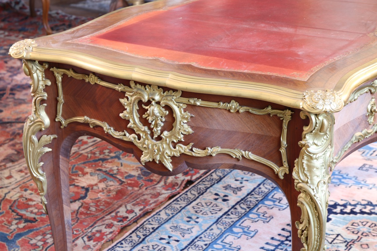 BUREAU PLAT dit "du DAUPHIN" en placage d'amarante et bronze doré. Plateau mouvementé foncé d'un cuir bordeaux gaufré à l'or, ouvrant par un tiroir central dans sa ceinture et reposant sur quatre pieds galbés. Très belle ornementation toutes faces de bronzes et cuivres dorés tels que lingotière, chutes et sabots, agrafes et médaillons en encadrements sur la ceinture. Signé sur la serrure du tiroir centrail : "Sormani Paris 10 rue Charlot".