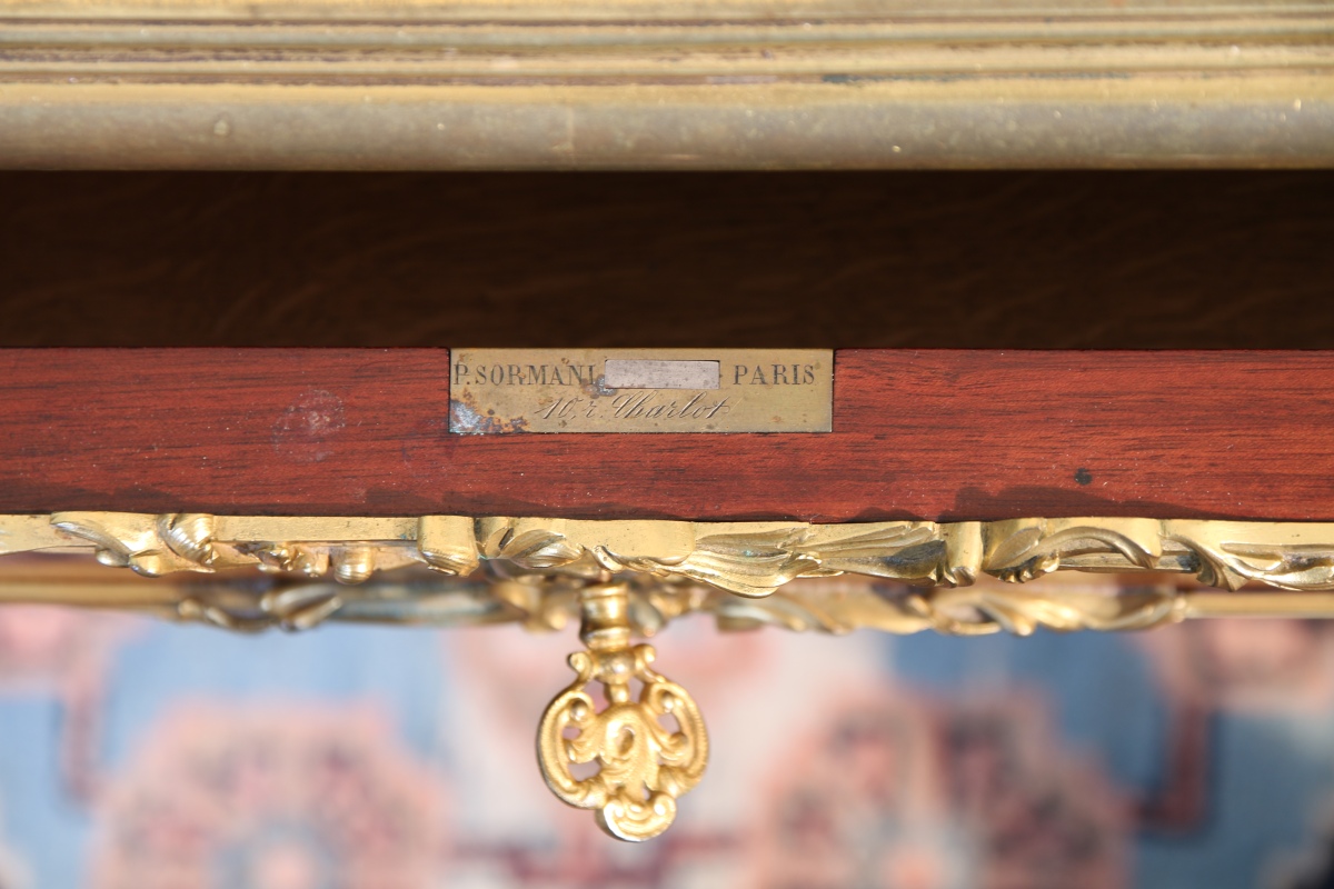 Né à Canzo en Lombardi, Paul SORMANI (1817-1877) épouse la fille d'un fondeur de cuivre et s'installe à partir de 1847 à Paris comme fabricant de meubles dans le quartier de la Bastille. La maison prend une grande extension, produisant avec une qualité d'exécution de premier ordre des meubles de styles Louis XV et Louis XVI. Multiple médaillé des Expositions Universelles de Paris et Londres, il exerce jusqu'à sa mort. Sormani réalise ce bureau d'après l'original livré en 1745 au Grand Cabinet à Versailles par Bernard II Van Risien Burgh, dit B.V.R.B., reçu maître avant 1730, pour le dauphin fils de Louis XV. Le bureau du Dauphin par B.V.R.B., est retourné à Versailles en 1953.