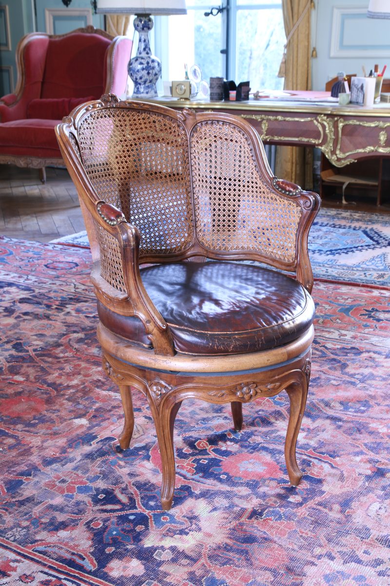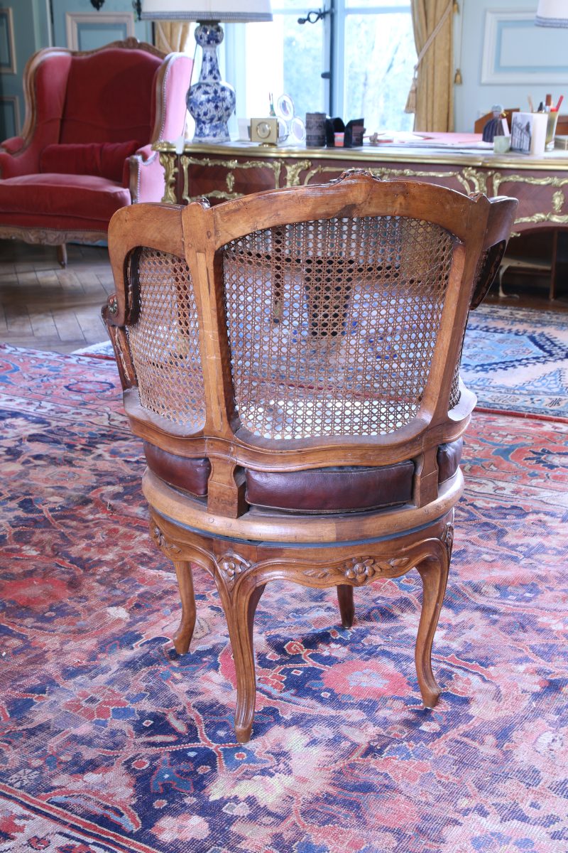 FAUTEUIL DE BUREAU en hêtre mouluré et sculpté, dossier gondole avec des accotoirs à manchette de cuir, assise circulaire pivotante, ceinture sculptée de fleurettes. Il repose sur quatre pieds nervurés et galbés.