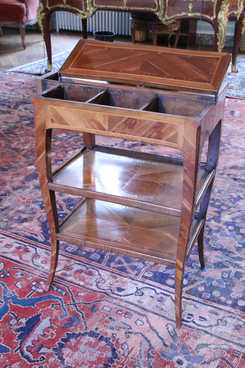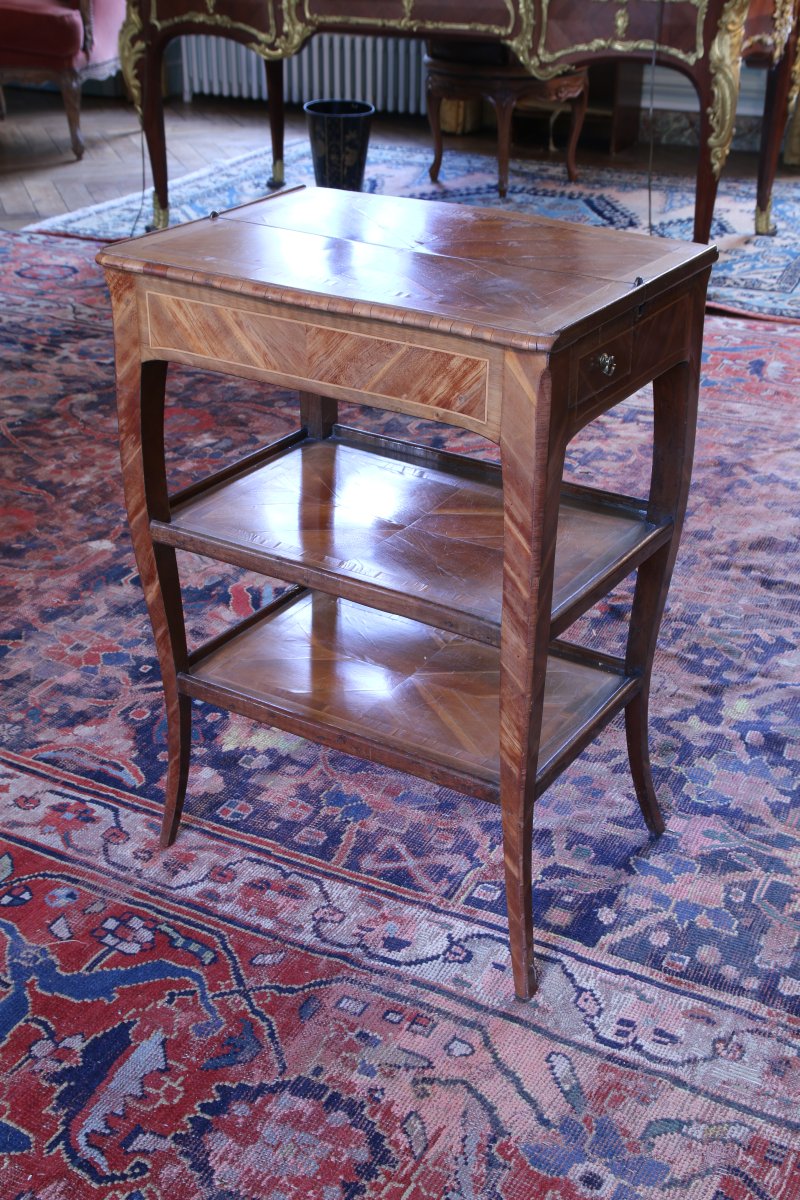 Petite TABLE VOLANTE en bois plaqué en frise, le plateau de forme rectangulaire mouvementé s'ouvre en deux, un tiroir en ceinture sur le côté. Elle repose sur quatre pieds galbés réunis par deux tablettes d'entrejambes.