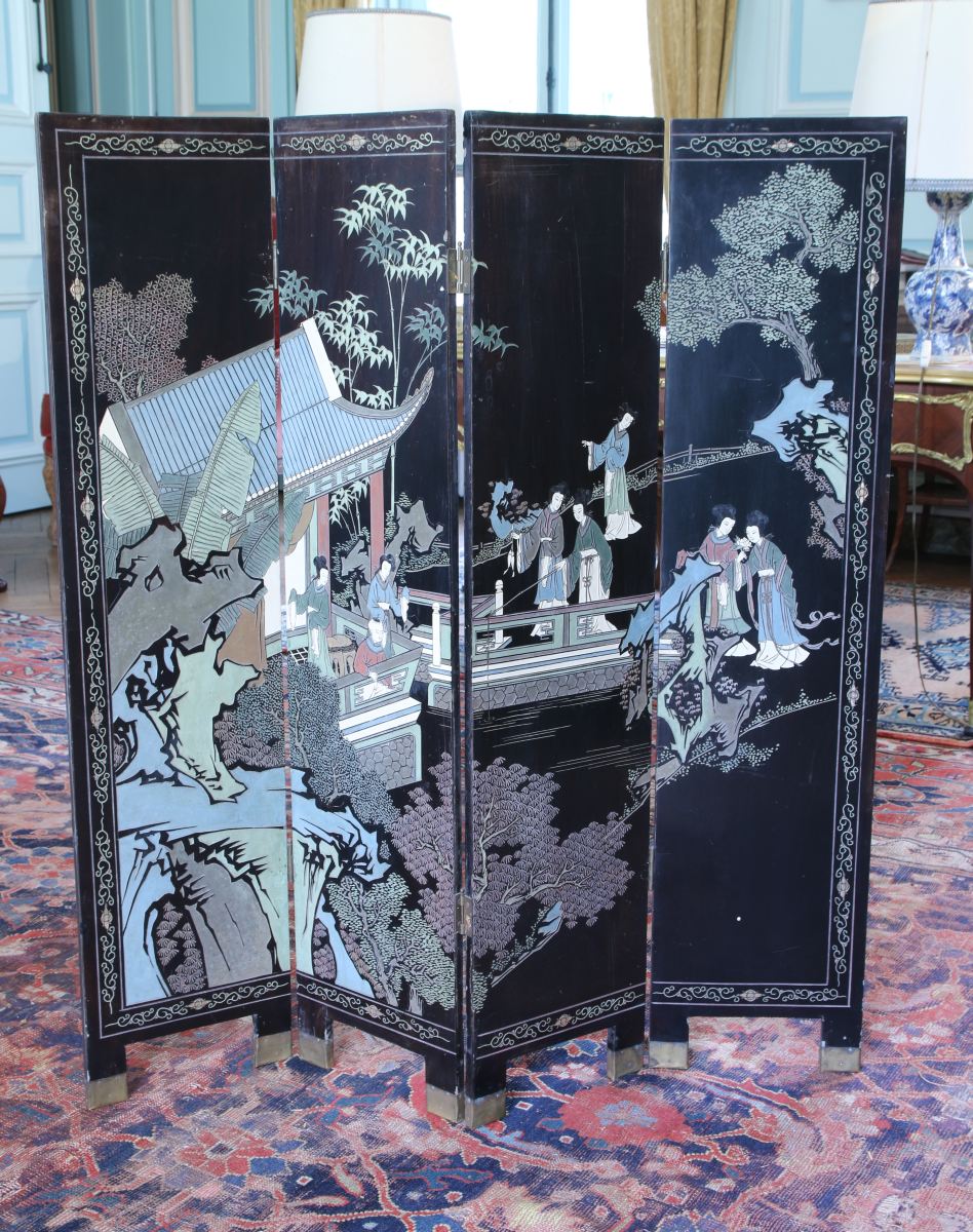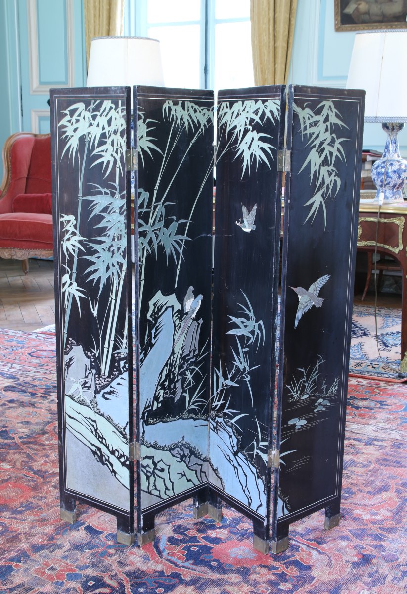 PARAVENT à quatre feuilles. Décor de laque gravé sur les deux faces à la manière de Coromandel ornée d'une part de paysage aux oiseaux branchés sur des bambous et d'autre part de scènes de Jardin. XXe.