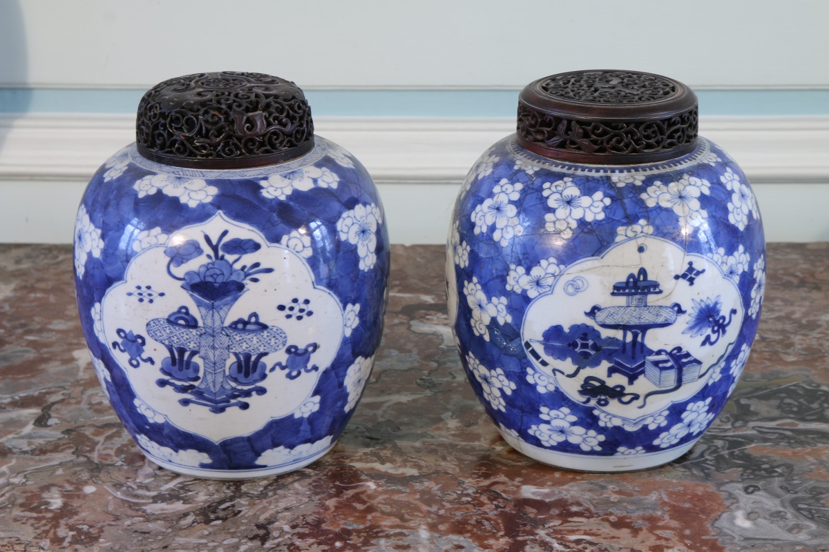 CHINE. Deux POTS À GINGEMBRE en porcelaine bleu et blanc. L'un à décor de dragon dans un cartouche entouré de fleurs, l'autre de vases fleuris. Couvercle en ébène ajouré et sculpté d'arabesques.