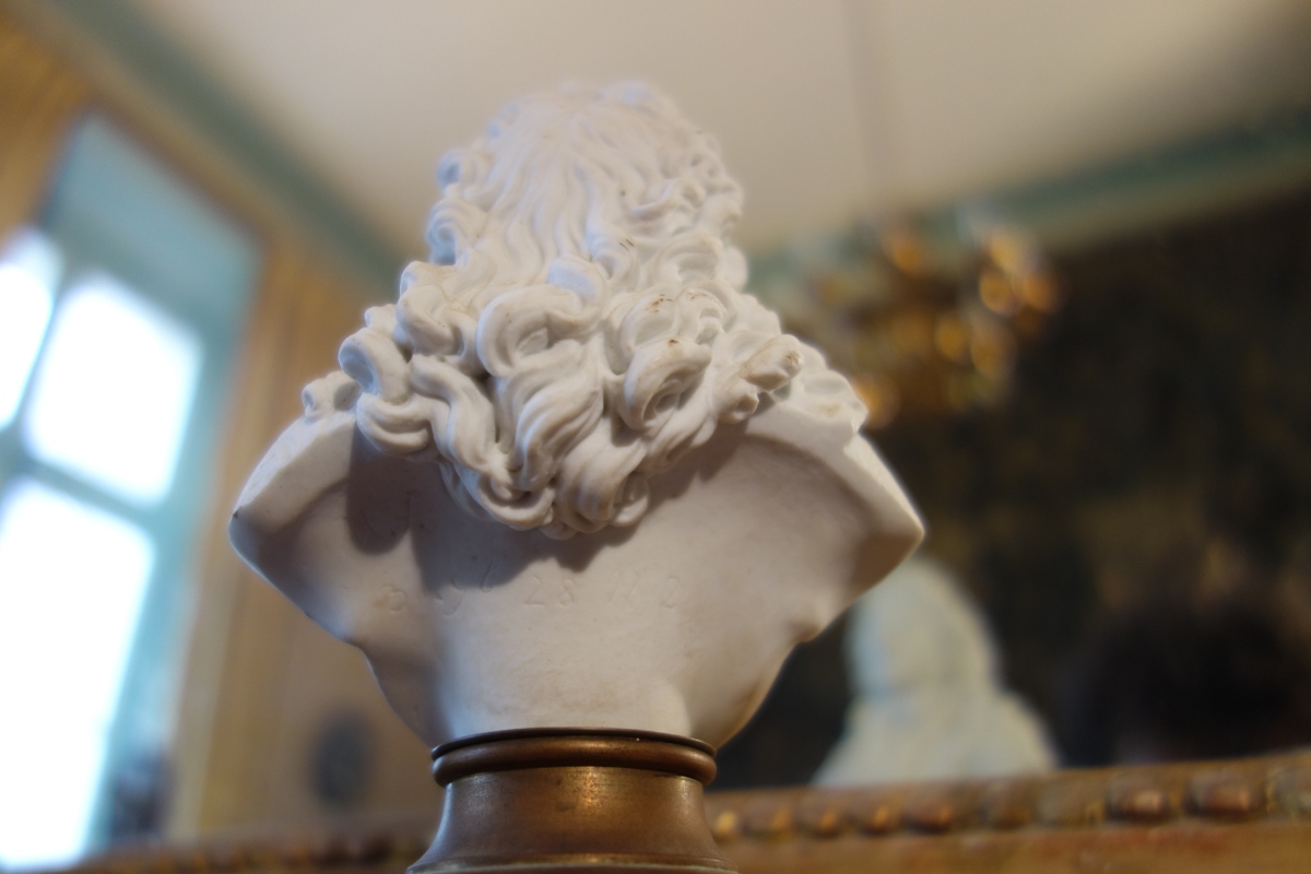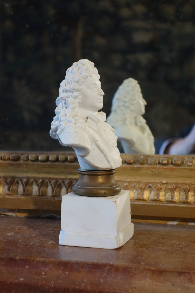 SÈVRES. LOUIS XIV. Buste en biscuit. Marques en creux à l'arrière (MF 3 7b 28 11 2), sur un piédouche métallique et un socle cubique en biscuit (accidents). Étiquette précisant l'achat pour "1.0000 francs chez Lafont à Amboise) le 7.8.51". Modèle d'Alexandre Brachard.