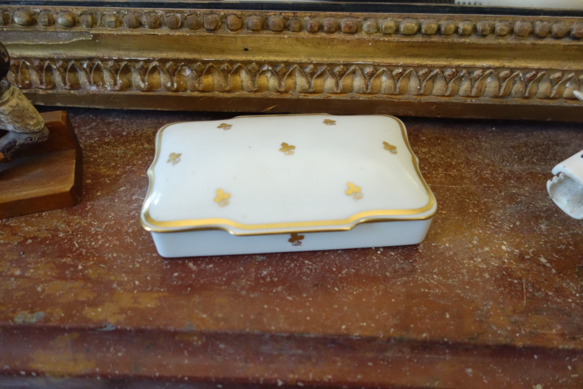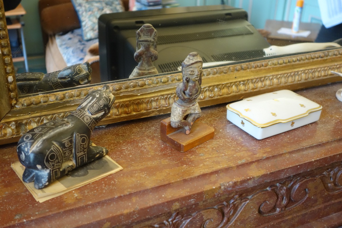 JOINT : BIBELOTS sur la cheminée, dont : POISSON taille dans un corail blanc, DIVINITÉ en céramique, BOÎTES en porcelaine, divers ANIMAUX et CHOUETTES.