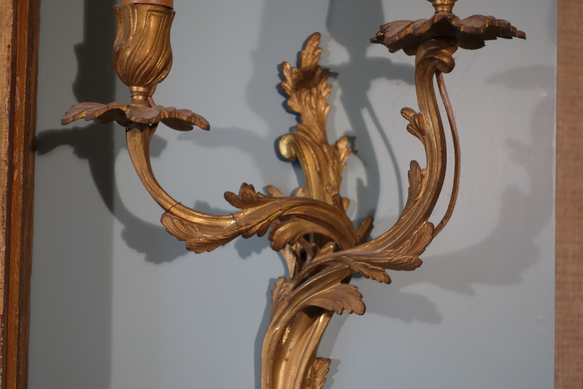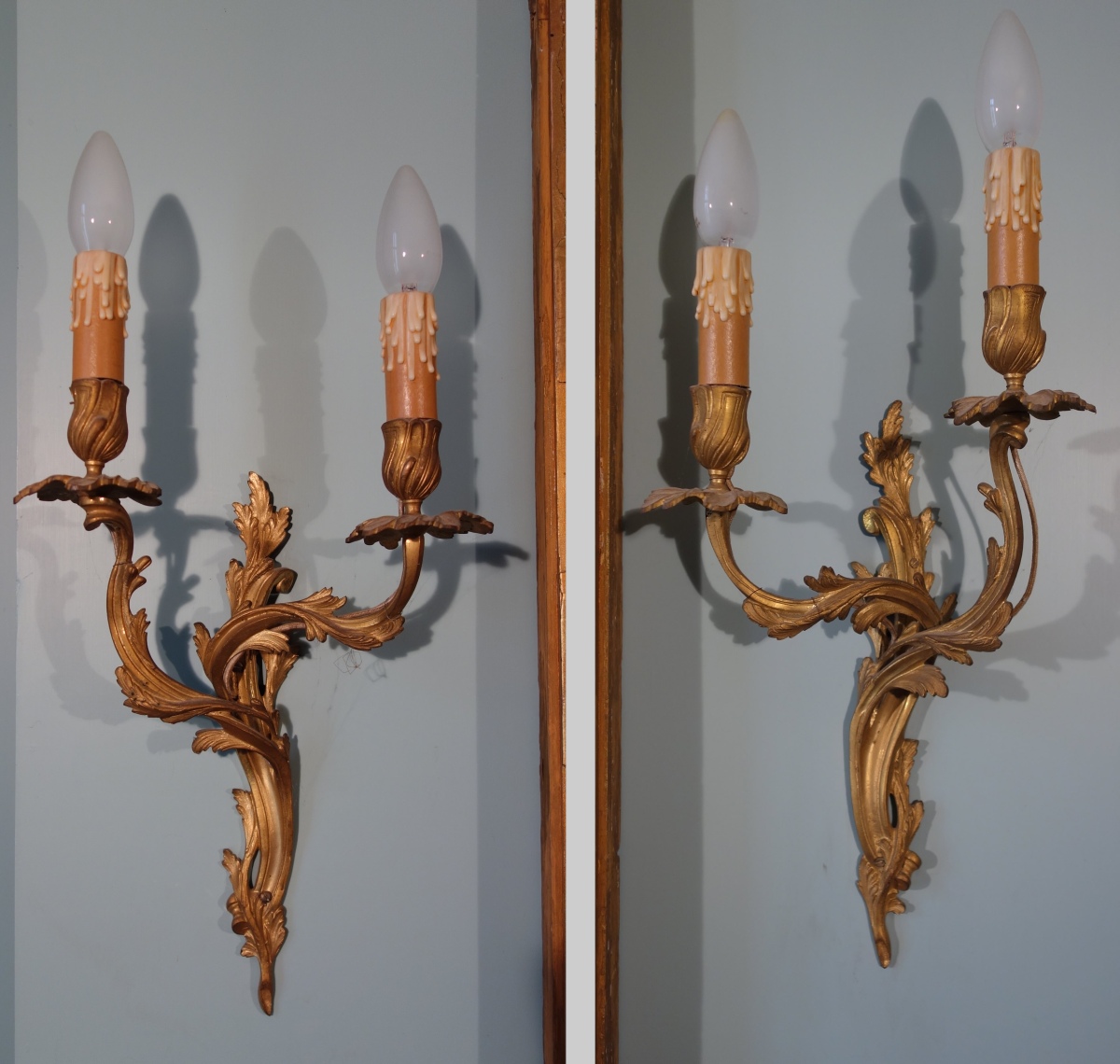 PAIRE D'APPLIQUES en bronze doré à deux bras de lumières richement feuillagés réunis sur un corps central figurant un rameau d'acanthe mouvementé.