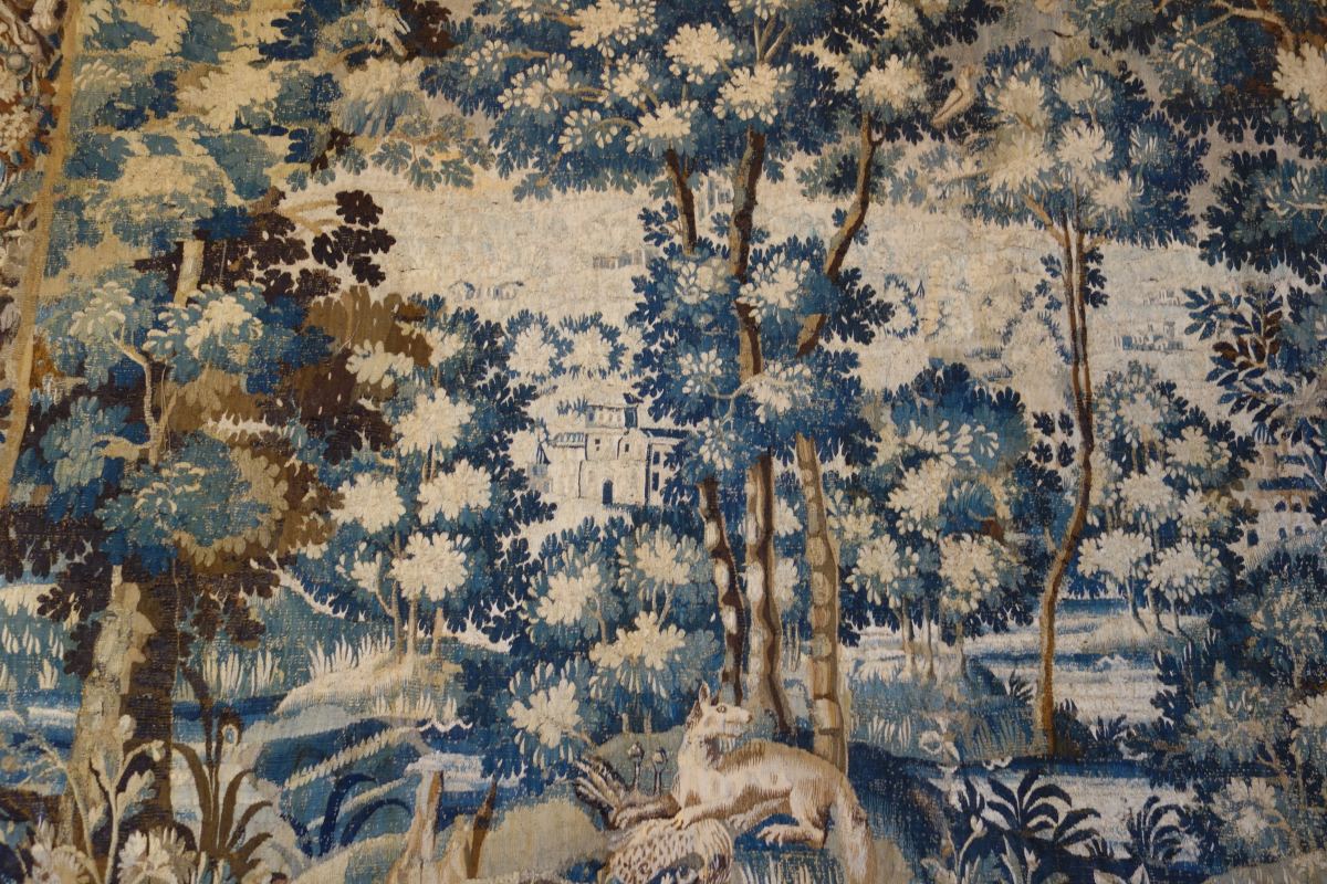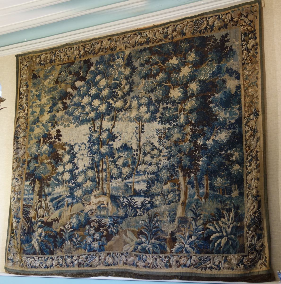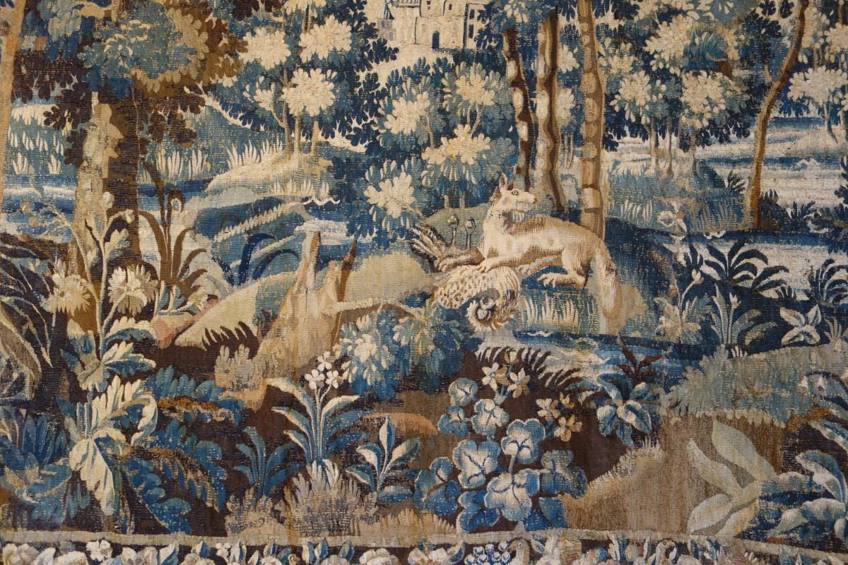 AUBUSSON. VERDURE. Tapisserie en laine figurant un fauve dévorant un volatile dans un paysage au village. Belle bordure à décor d'oiseaux et de fleurs.