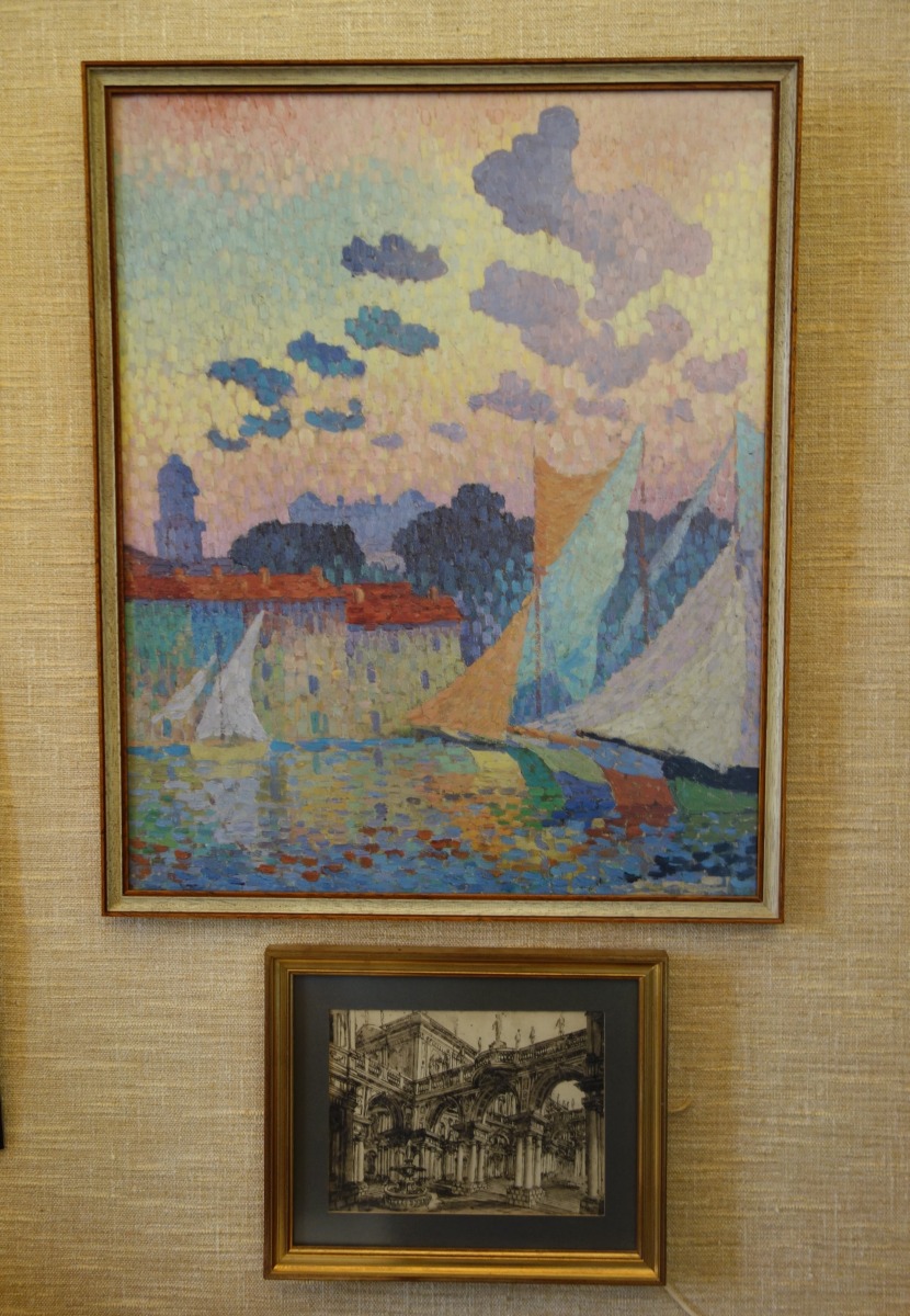 JOINT : gravure de mode rehaussée en couleur, portrait d'une vagabonde, aquarelle figurant La rivière d'Auray en 1996 et afiche d'un port pointilliste.