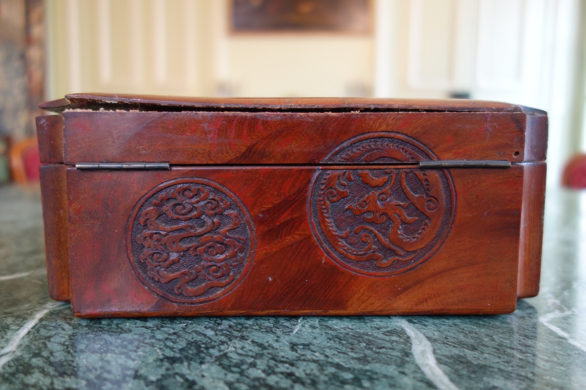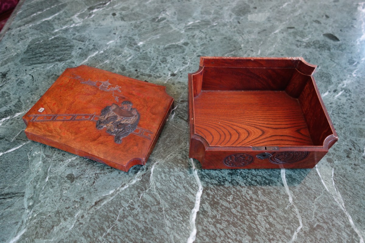JAPON. BOÎTE de forme rectangulaire à angles concaves en bois précieux. Le couvercle sculpté d'un décor paysagé appliqué d'un personnage lisant un rouleau sur une bête fantastique en cuivre patiné de deux tons. Les côtés ornés de cartouches sculptés de forme ronde. Signature dans un cartouche de nacre.