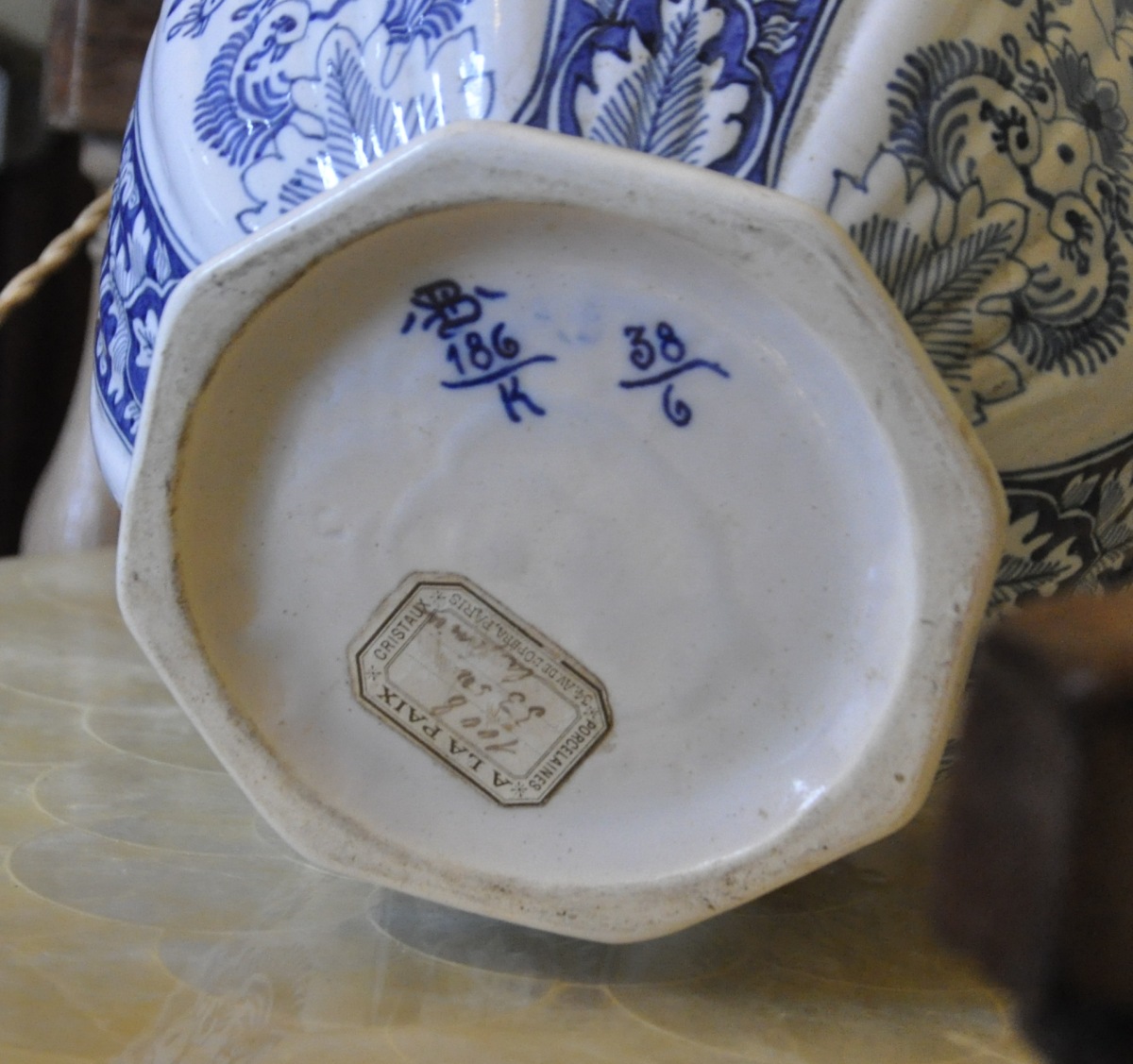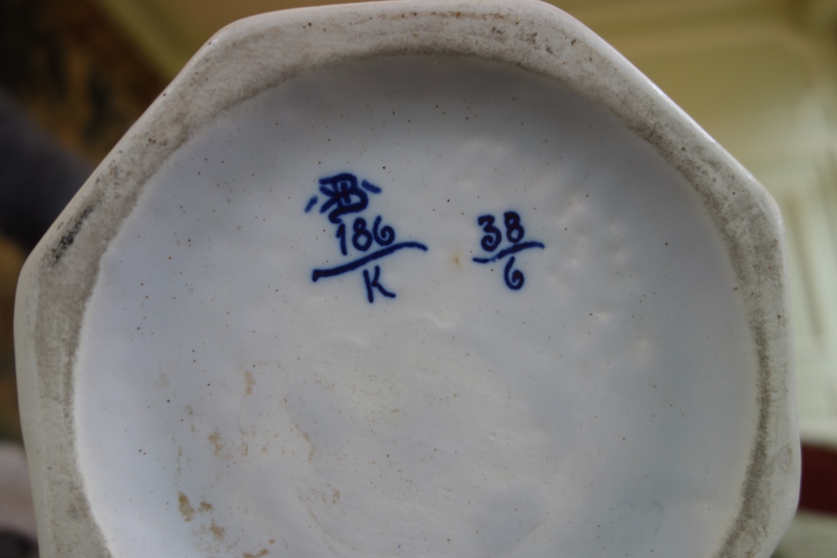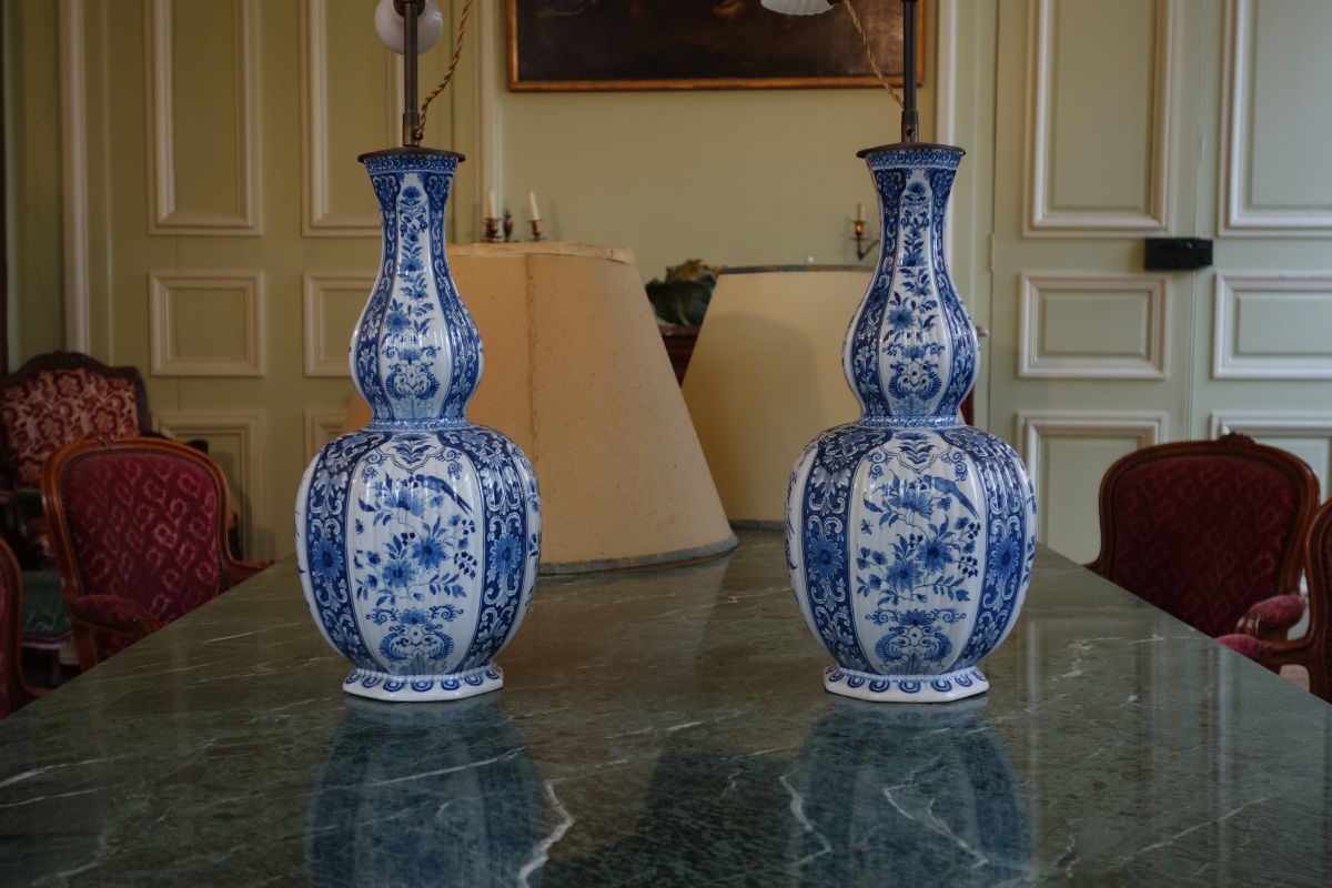DELFT ? Paire de VASES balustres godronnés à panse basse et haut col en porcelaine à décor bleu et blanc d'oiseaux et fleurs. Marque sous la base et et étiquette du magasin "A LA PAIX" sous l'un.