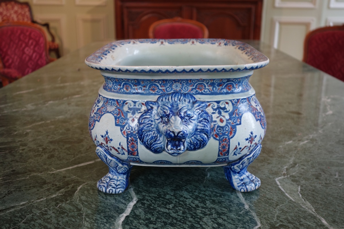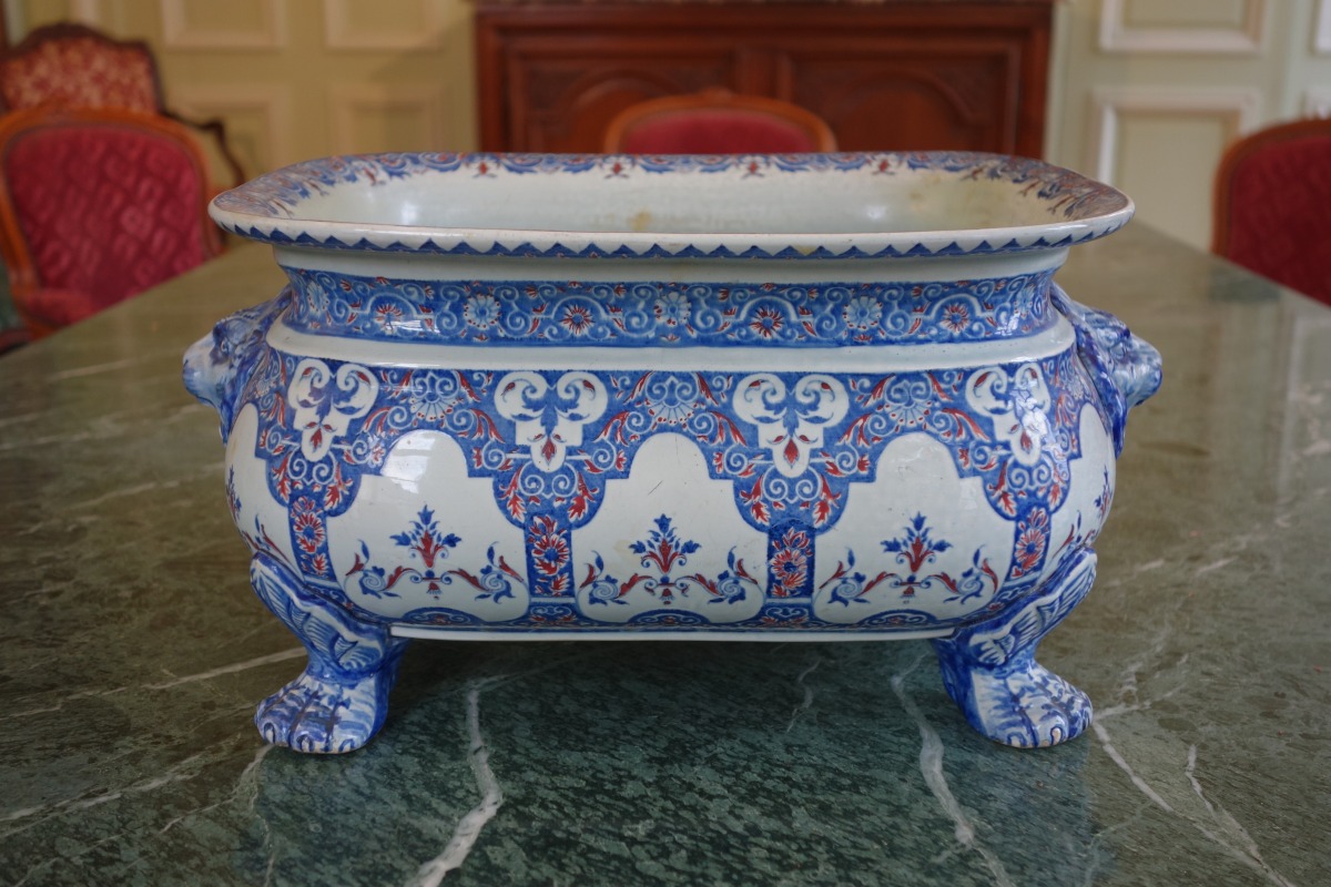 GIEN. JARDINIÈRE en faïence à décor en bleu et rouge dans le goût de Rouen. Anses en tête de lion. Elle repose sur quatre pieds griffes.
