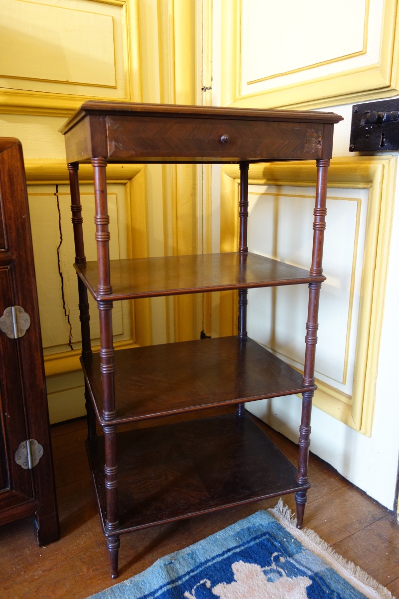 TABLE de service à quatre niveaux de forme rectangulaire en bois de placage. Elle ouvre par un tiroir en ceinture. Montants tournés et bagués.