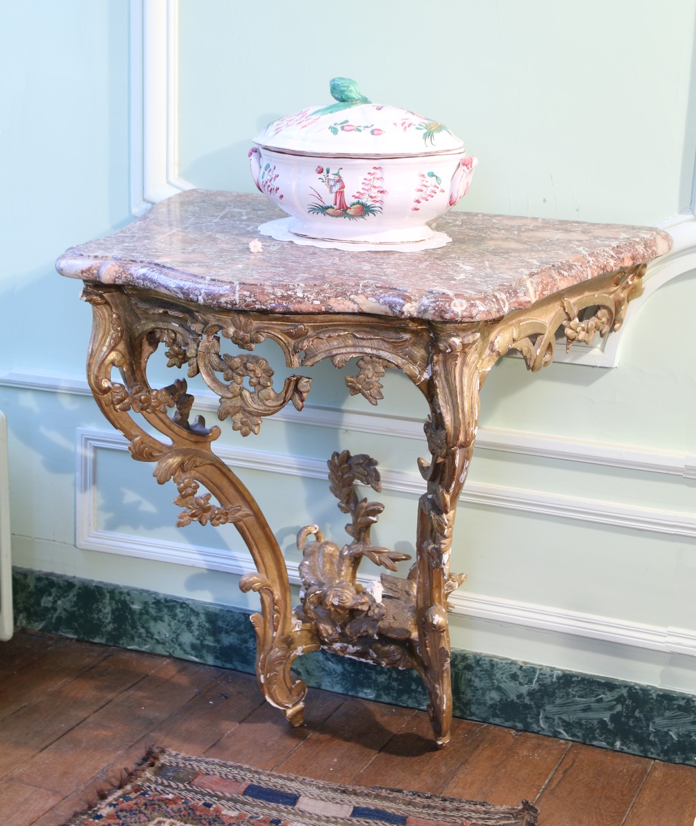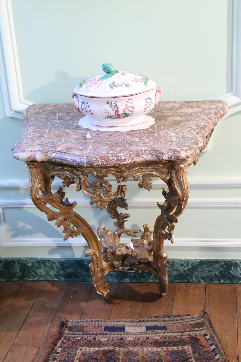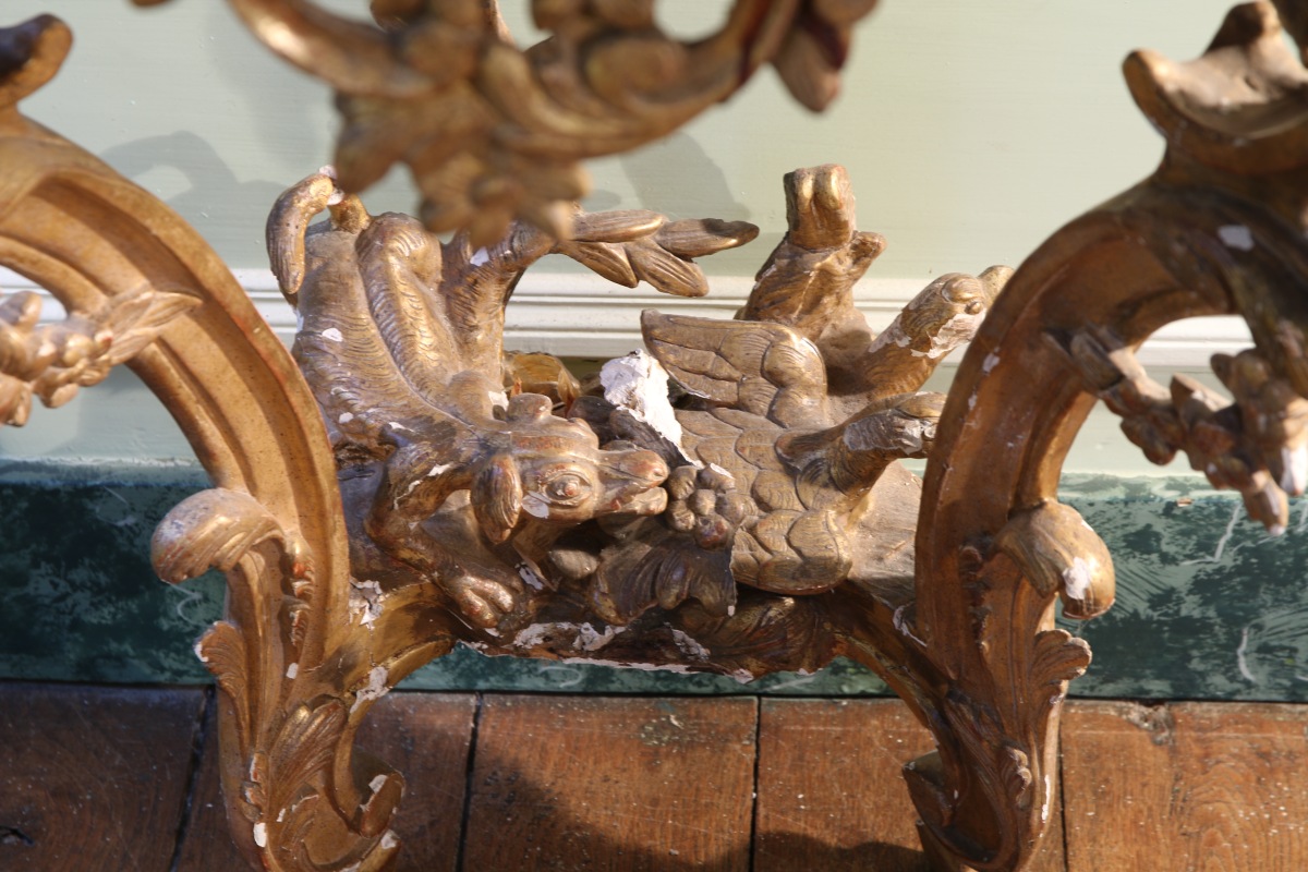 CONSOLE d'applique en bois sculpté, stuqué et doré. Riche décor ajouré d'acanthes, guirlandes de fleurs et agrafes. Entretoise animée d'un chien pourchassant deux canards. Repose sur pieds à enroulement.