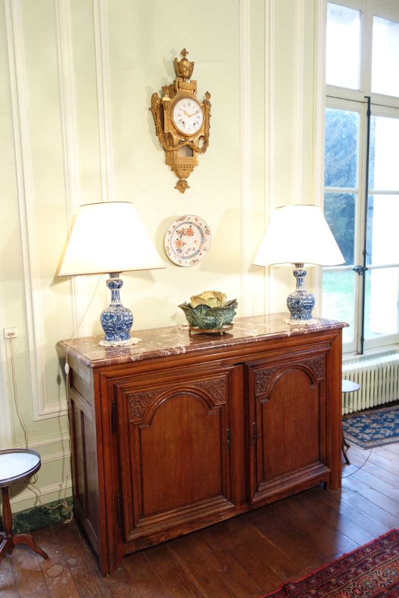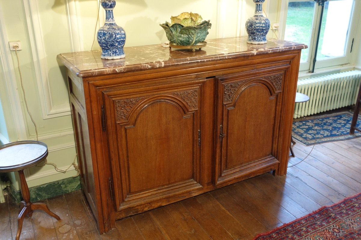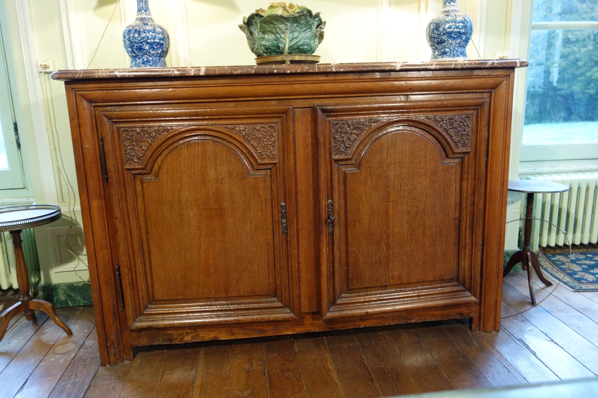 Paire de BUFFETS en bois naturel mouluré et sculpté. Ils ouvrent par deux vantaux sculptés de rinceaux, coquille et agrafes en partie supérieure. Ils reposent sur quatre pieds droits. Dessus de marbre rouge royal.