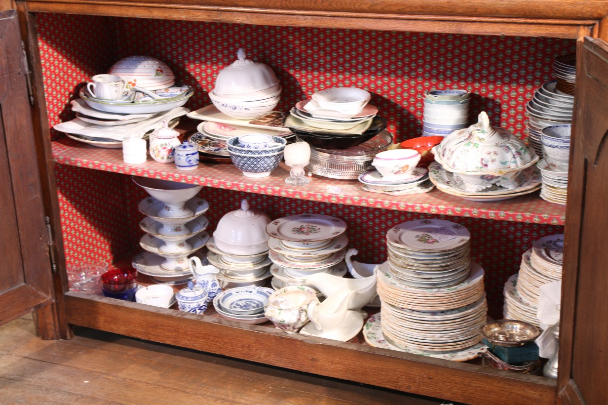 CONTENU de buffet dont PARTIES de SERVICES en céramique, notamment un SERVICE à dessert en porcelaine, 23 pièces, à décor floral polychrome et rehauts or. Il se compose de 7 assiettes montées, 4 coupes et 12 assiettes. A découvrir.