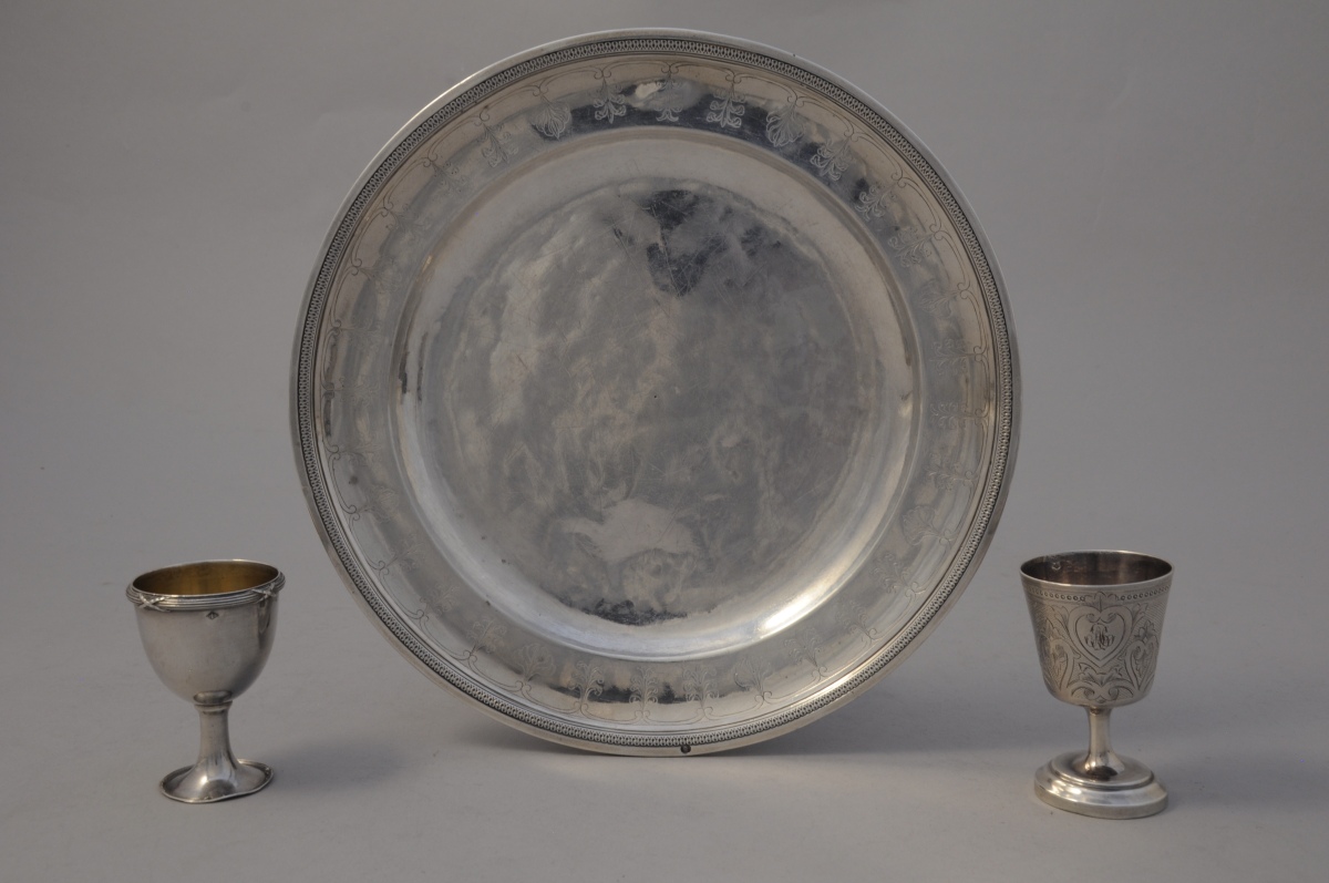 - L'un monogrammé est orné d'un décor gravé de curs, feuilles d'acanthe et rais de perles sur fond amati. Poinçon Minerve. Haut. 7 cm. Poids : 40g.