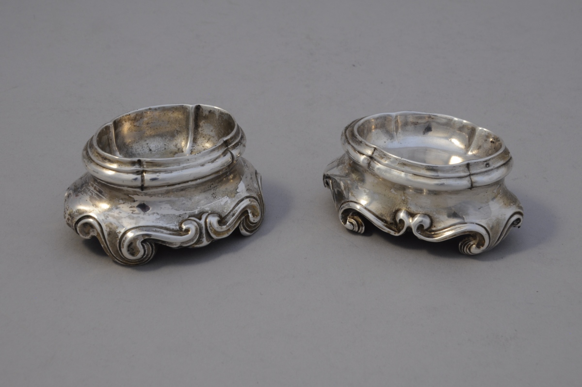 Deux SALERONS en argent formant paire de forme ovale. Bordure chantournée à degrés et piètement plein terminé en enroulements et agrafes affrontées.