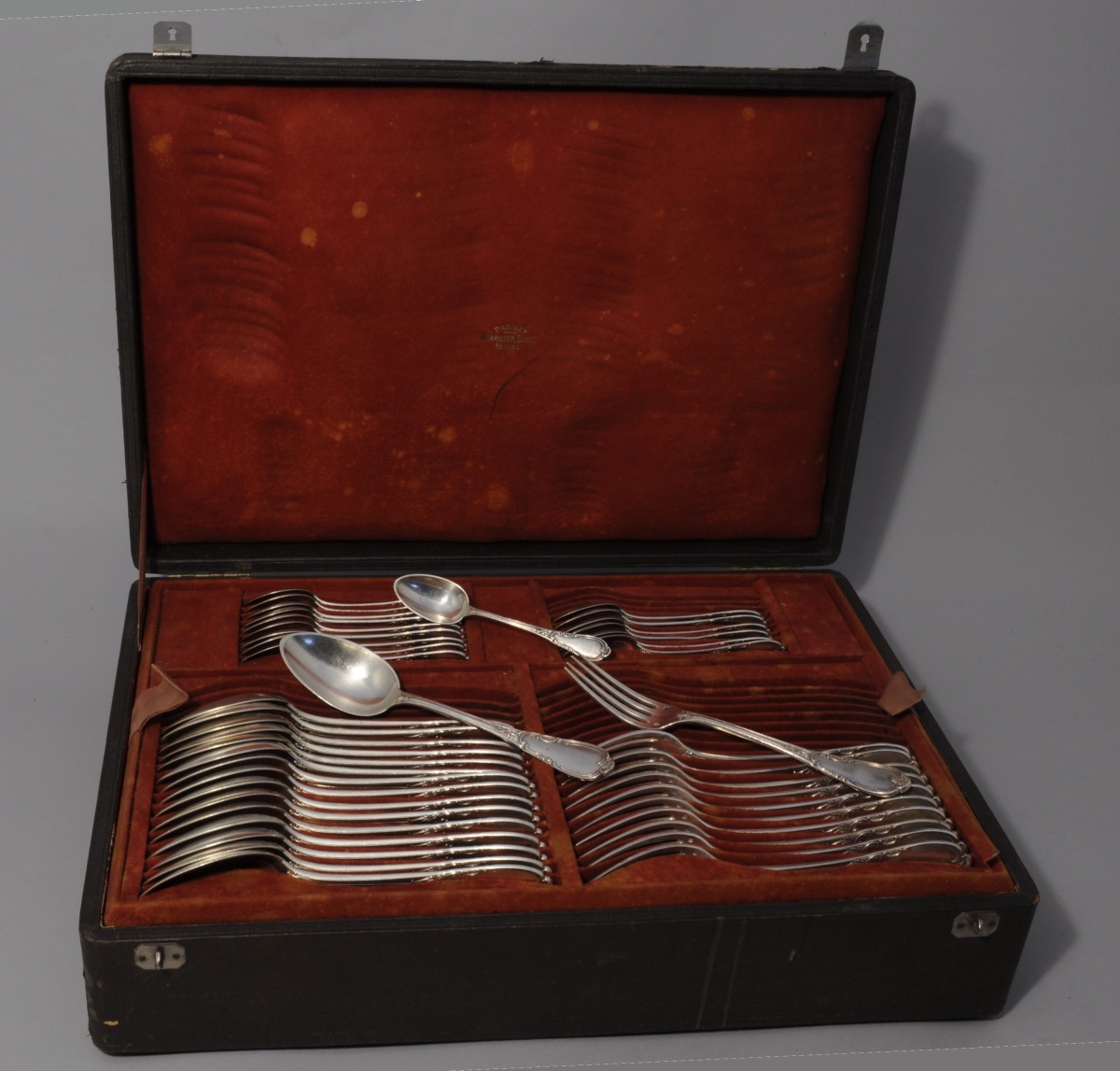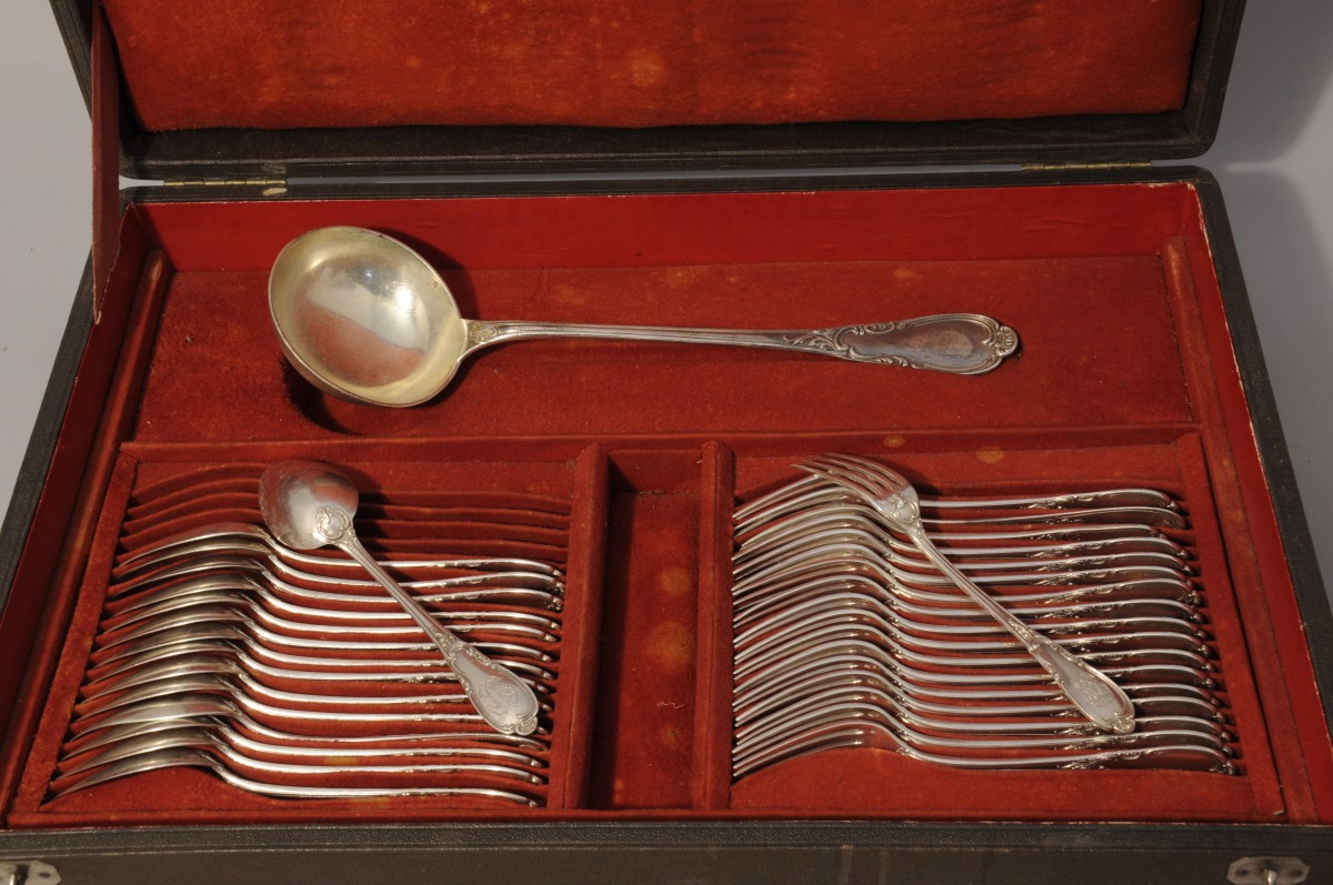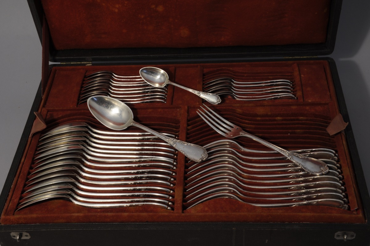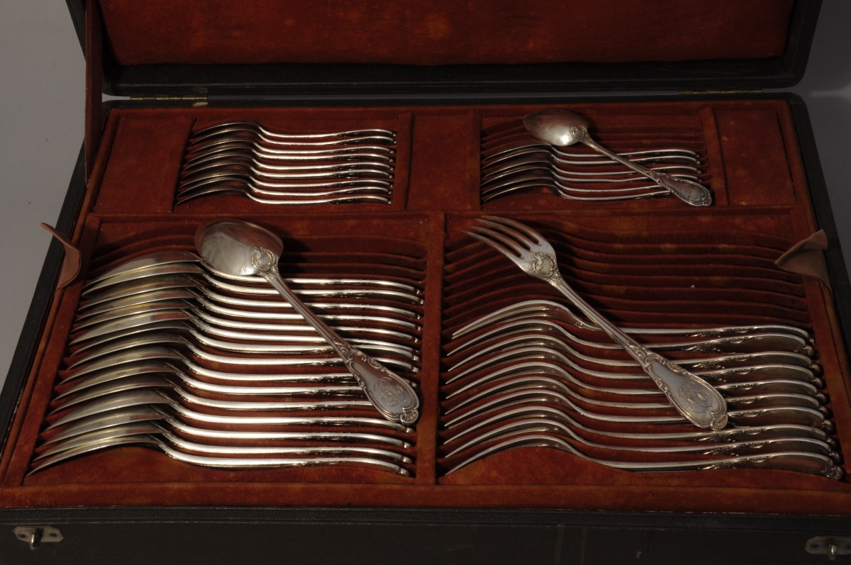 MÉNAGÈRE en argent, 77 pièces, composée de 11 couverts de table, 5 cuillères de table, 15 couverts à entremets, 3 fourchettes à entremets, 16 cuillères à café et 1 louche.