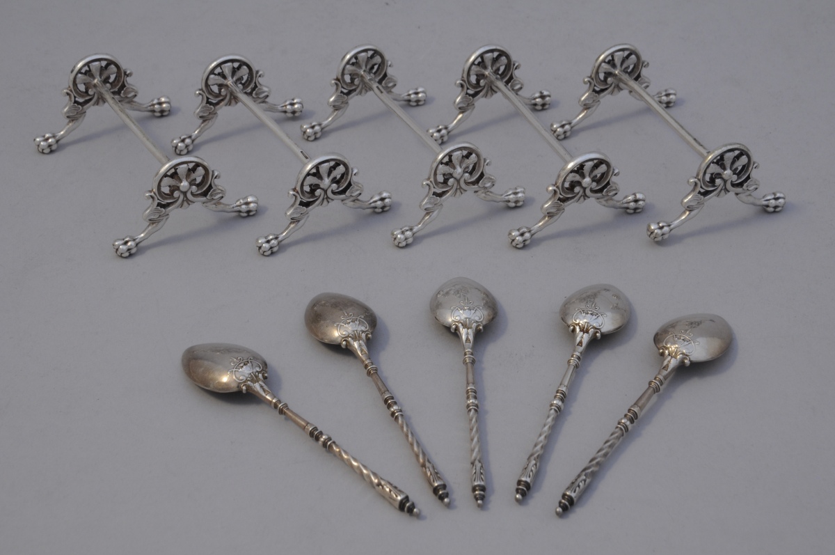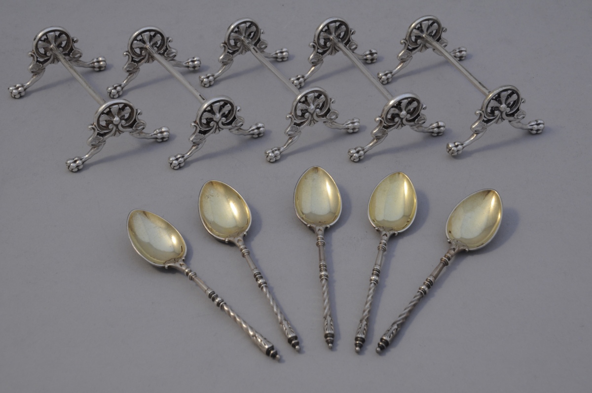 CHRISTOFLE. Cinq PORTE-COUTEAUX en métal argenté. Modèle à décor de feuillages et griffes de lion.