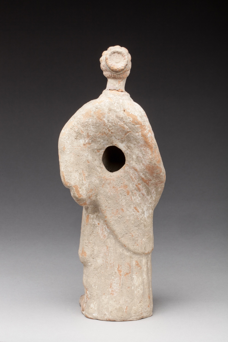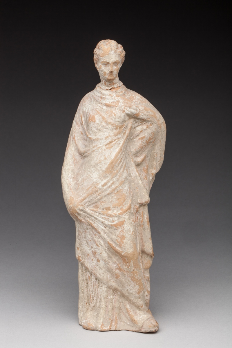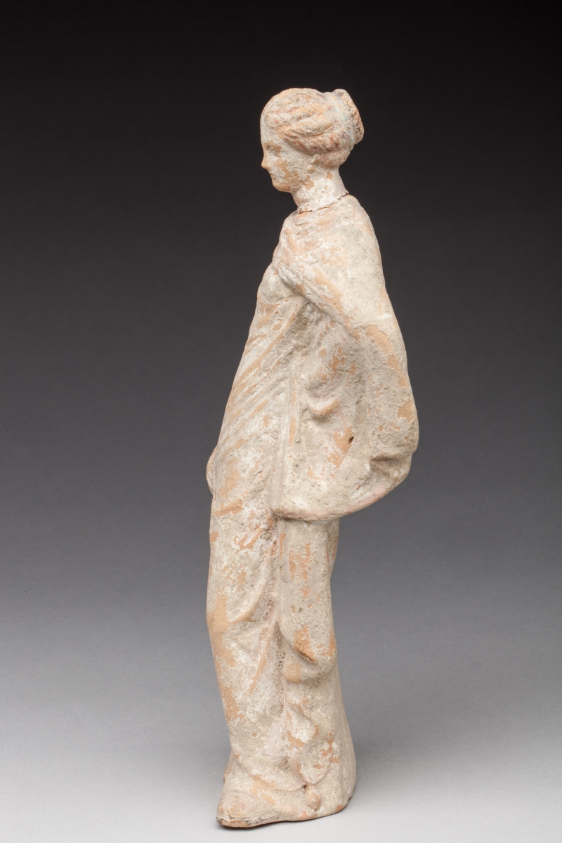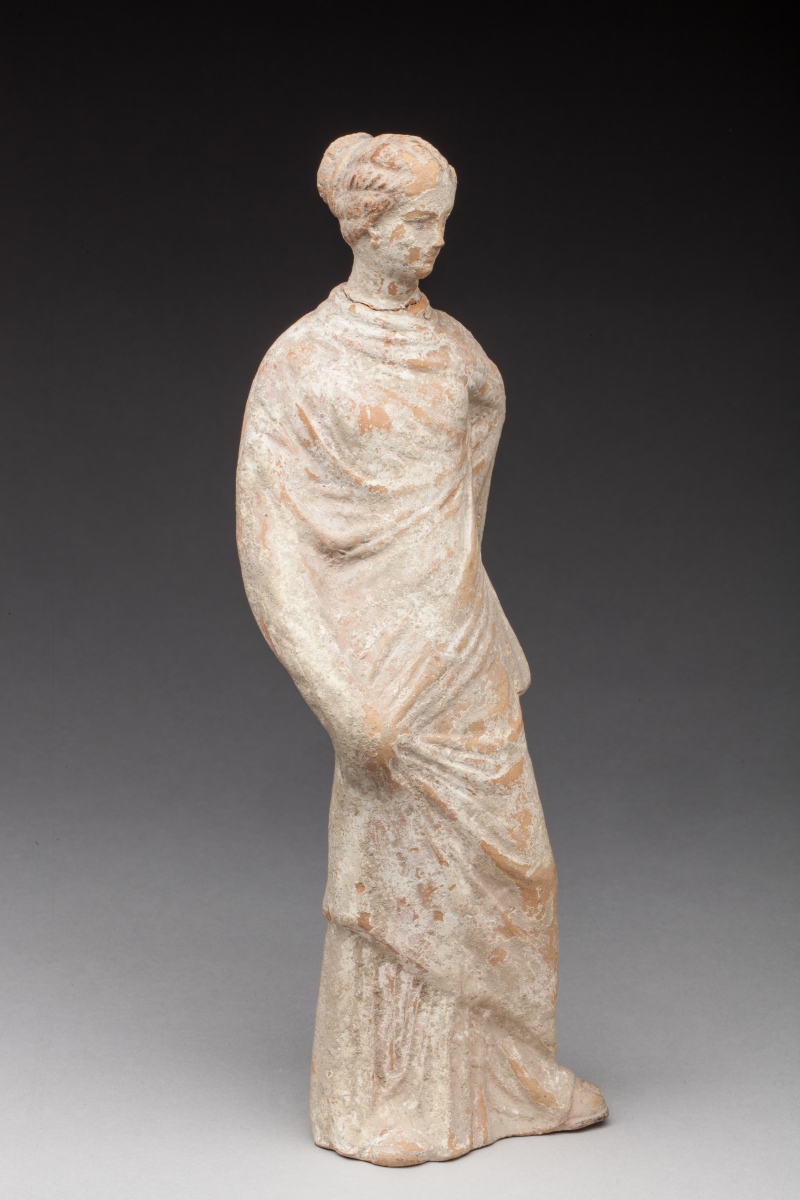 STATUETTE. Jeune femme debout vêtue d'un manteau drapé (himation) dont elle retient un pli de la main droite, le bras gauche recouvert de l'étoffe. Chevelure ondulée avec chignon.