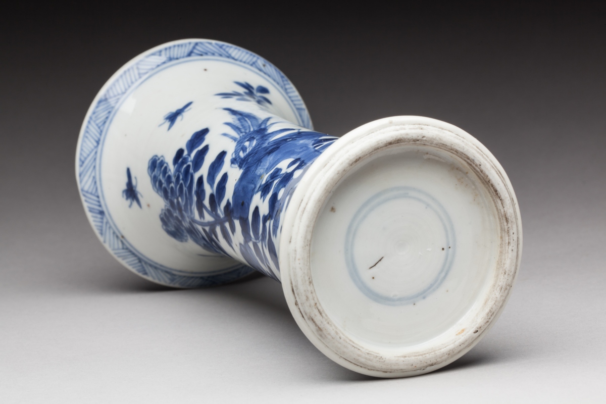 VASE rouleau en porcelaine décorée en bleu sous couverte de paon sur un rocher fleuri de pivoines.