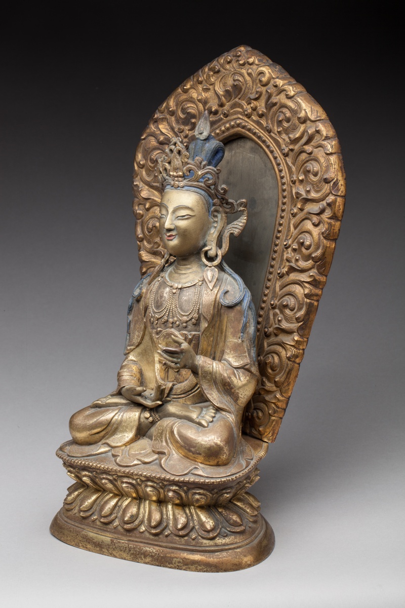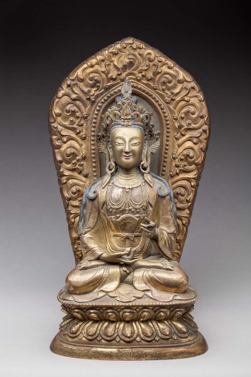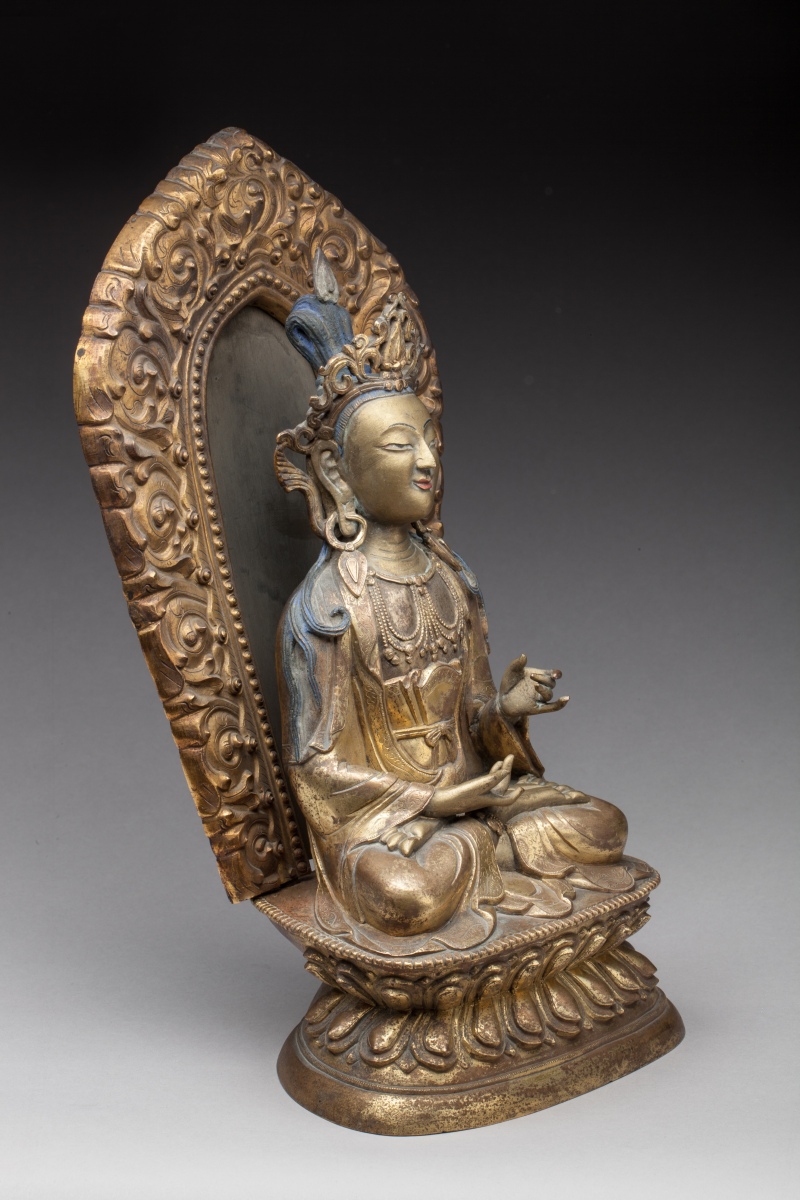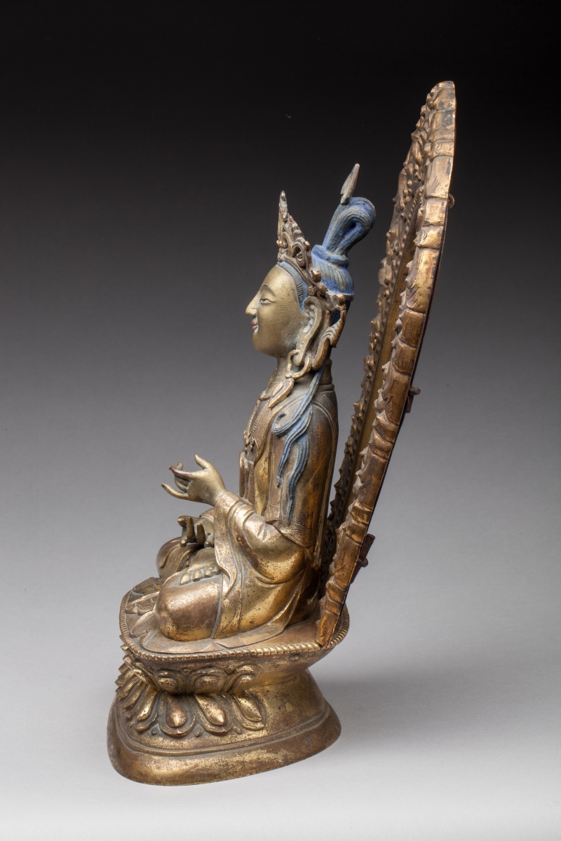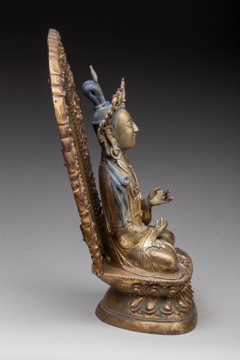 STATUETTE de bouddha en bronze doré, le visage laqué or et polychrome, assis en padmasana sur un socle en forme de double lotus, les mains en karana mudra (geste qui repousse les démons), il est paré de bijoux et boucles d'oreilles, la couronne ornée de fleurs. Il est assis devant sa mandorle en cuivre doré repoussé.