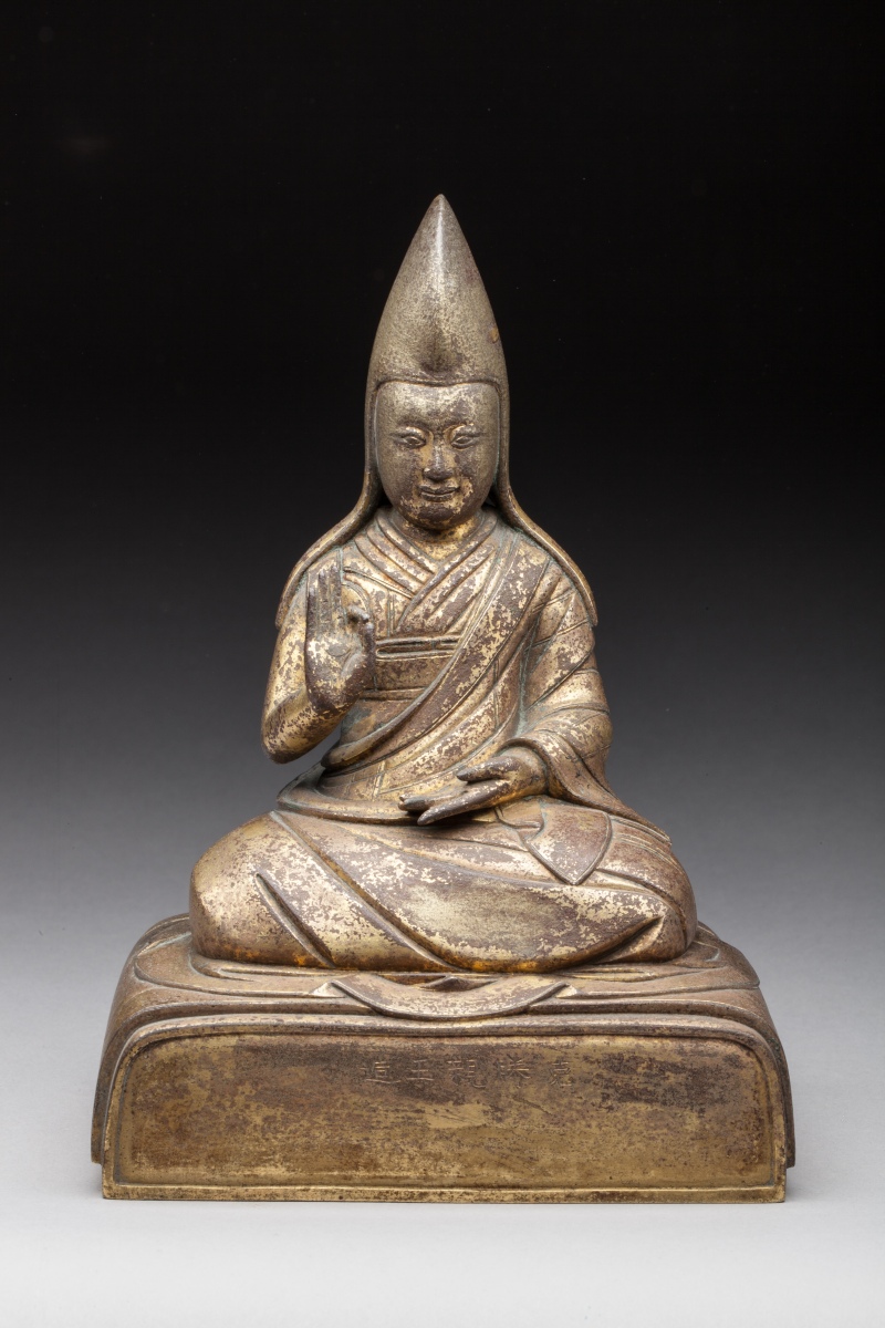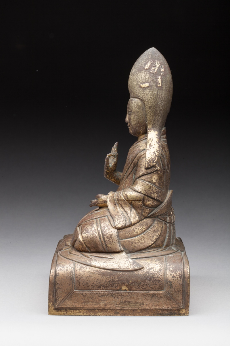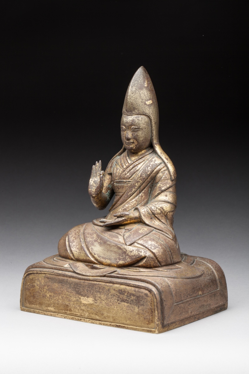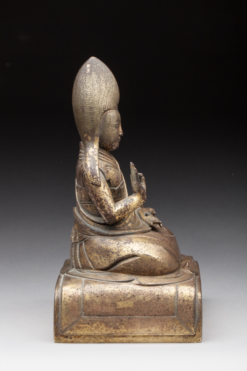 STATUETTE de Lobsang Chökyi Gyalsten, (1567-1662) quatrième Panchen Lama, en bronze doré, assis en padmasana sur sa base rectangulaire, la main droite en vitarka mudra (geste de l'enseignement), la gauche en dhyana mudra tenant initialement un livre (ici manquant). Sur le socle, la marque Sheng Ting Wang zao.